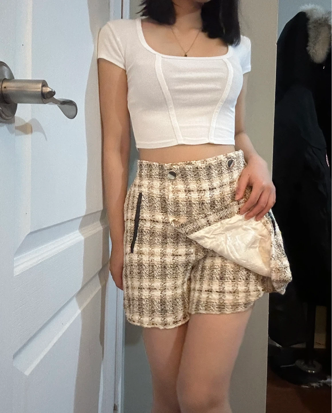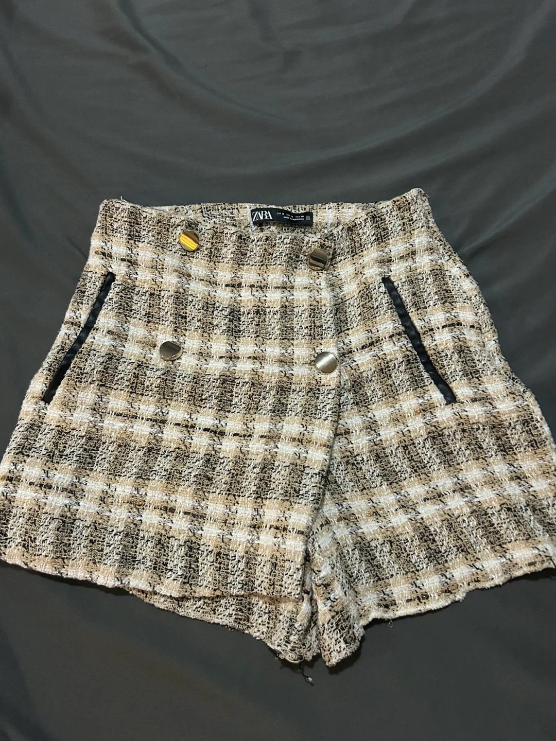 Selling a cute pair of Zara tweed shorts! They're a size small and feature a stylish plaid pattern with decorative buttons. Perfect for adding a touch of chic to your wardrobe! One button is loose.