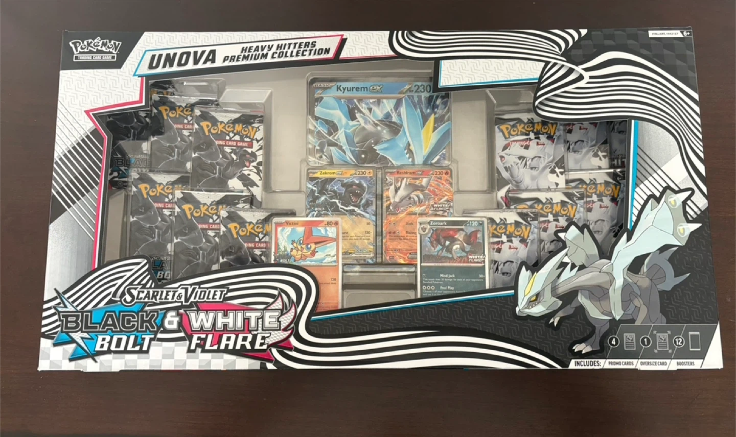 Selling a brand new Pokémon TCG Unova Heavy Hitters Premium Collection! This set includes foil promo cards featuring Kyurem ex, Zekrom ex, Reshiram ex, and Zoroark, plus an oversize foil promo card of Kyurem ex for display. You'll also find 6 Pokémon TCG Scarlet & Violet-Black Bolt booster packs and 6 Pokémon TCG Scarlet & Violet-White Flare booster packs, and a code card for Pokémon TCG Live. Perfect for any Pokémon collector or player!