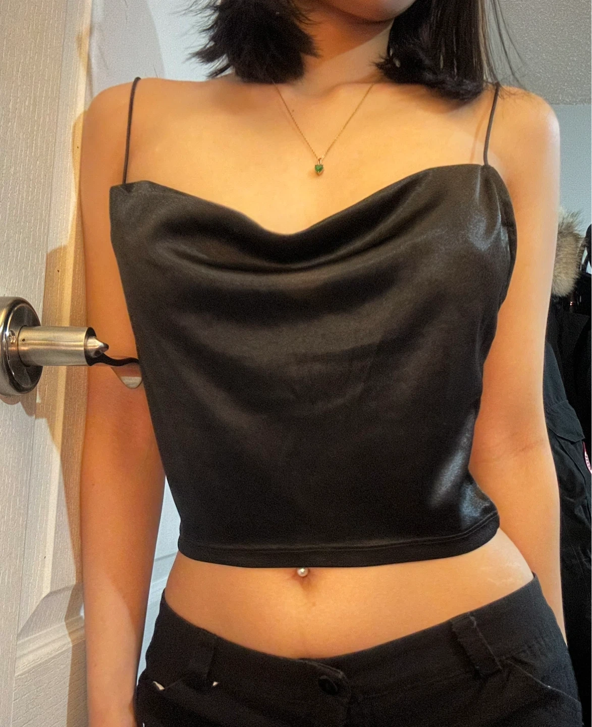 Selling a cute black cami top from DIVIDED H&M! It's a size small and in great condition. Perfect for a night out or just to dress up a casual outfit! The material has a nice sheen to it.