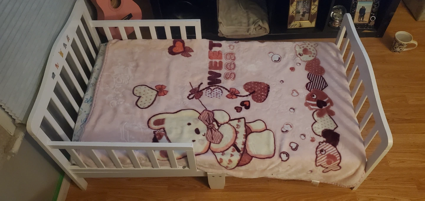 Selling a toddler bed. It's in great condition and ready for a new home! Perfect for transitioning your little one from a crib to a bed. It's low to the floor. Comes with safety rails, mattress Included. JPMA certified.