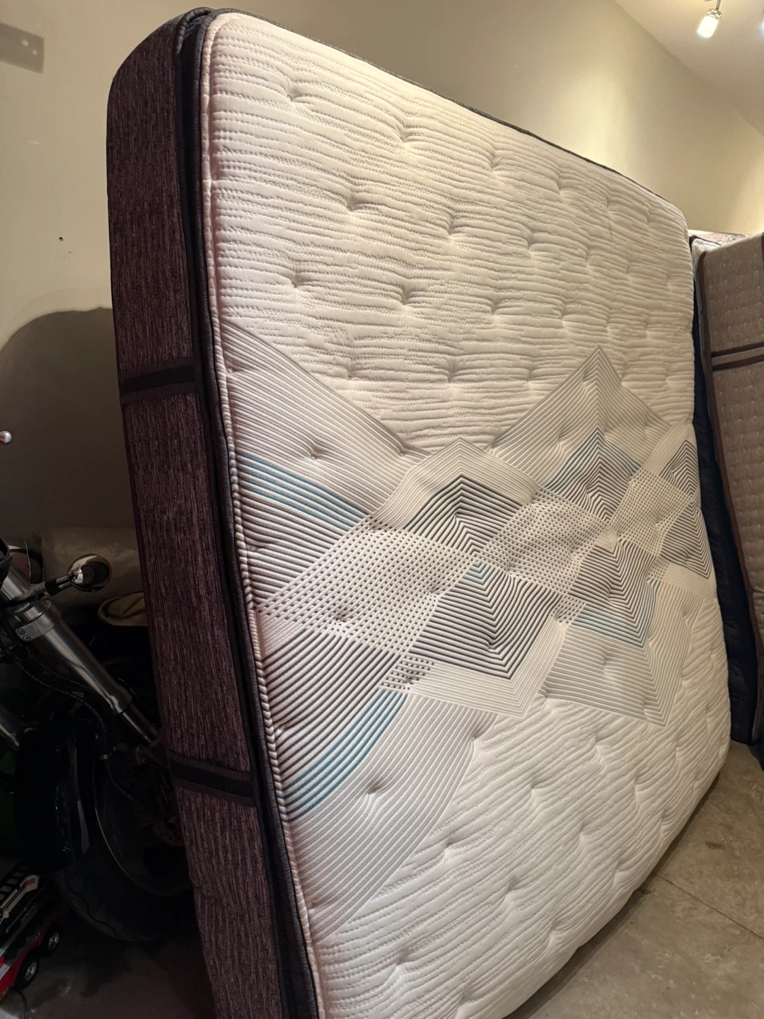 Pucup $210. Delivery $30 extra Selling a mattress in great condition. It has a white top with a geometric pattern and a dark brown border. It looks very comfortable and clean!