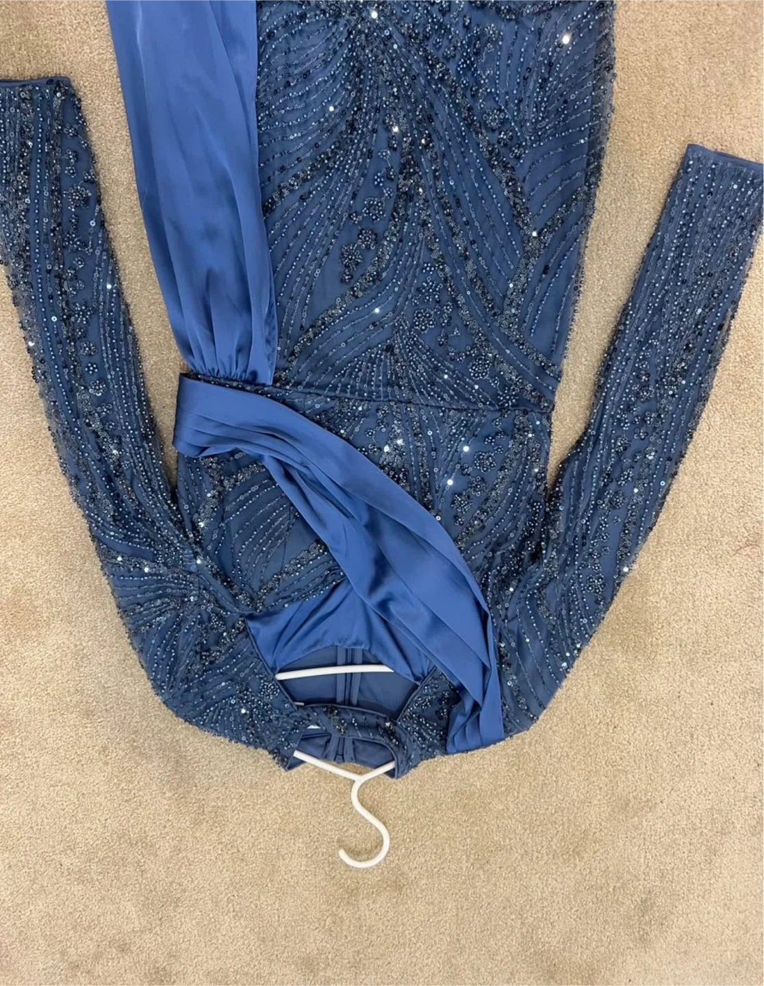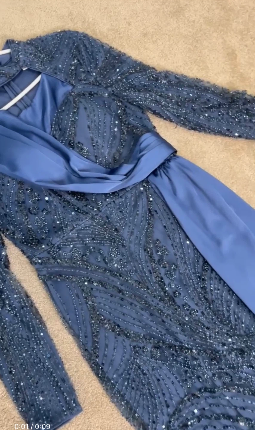 Beautiful dazzled blue dress long sleeves, modest and back covered.