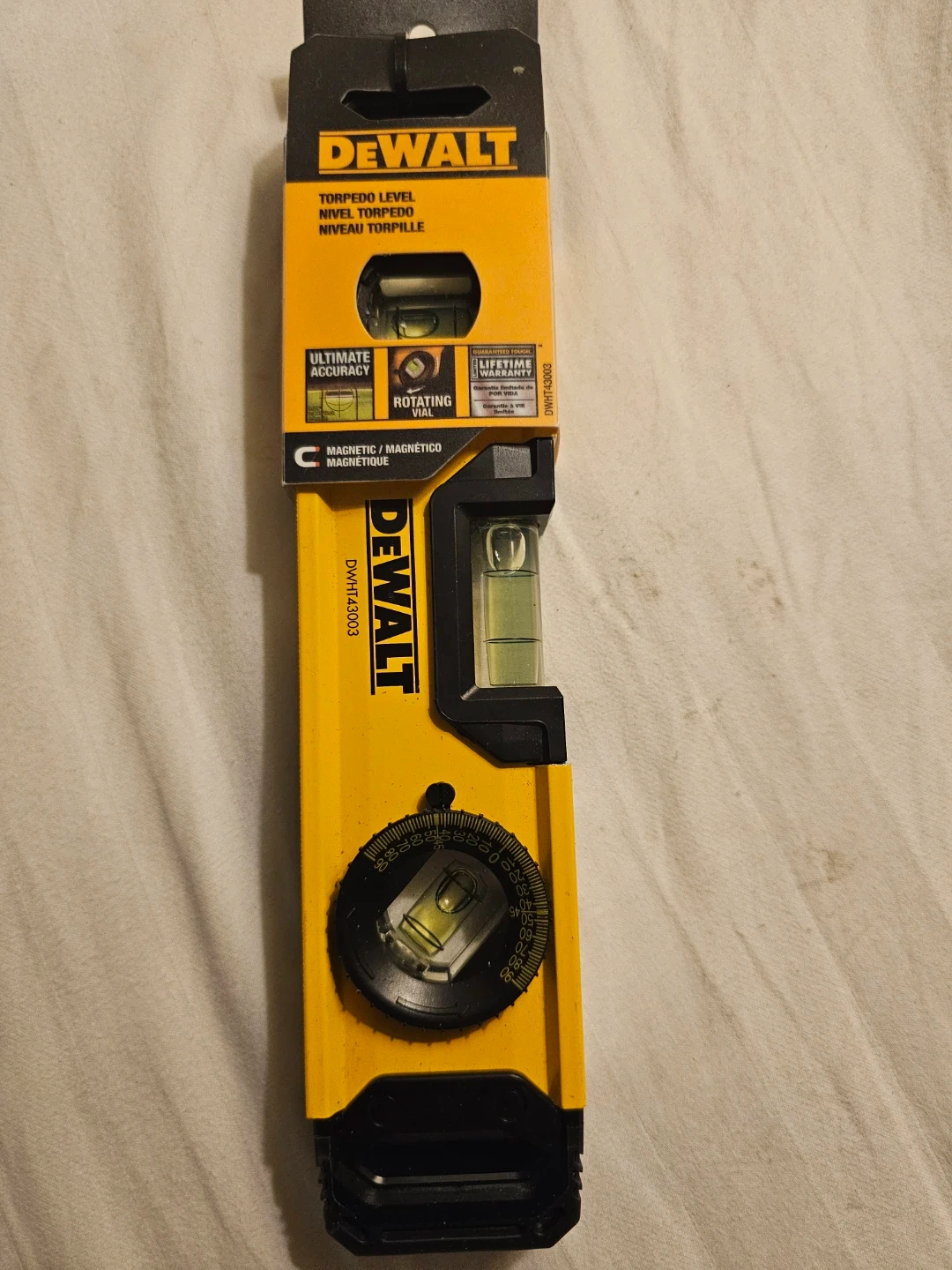 Selling a brand new DeWalt Torpedo Level, still in its original packaging! This level features an aluminum body for durability and lightweight design. It's accurate to 0.5mm/m, ensuring precise measurements. The level also boasts a rotating dial for easy angle adjustments. It's magnetic, making it convenient to use on metal surfaces!