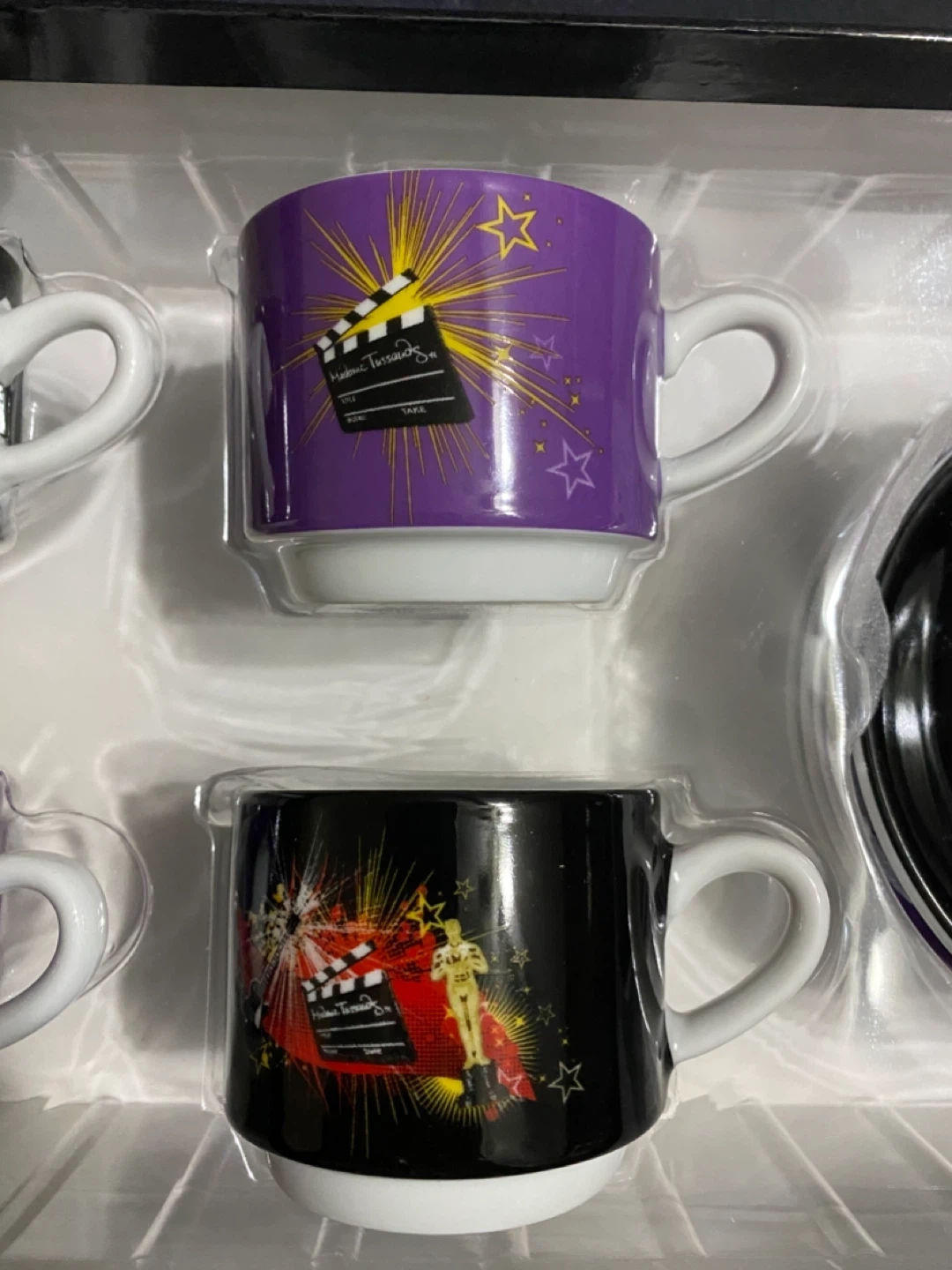 Selling a set of Madame Tussauds espresso cups and saucers! The set includes four espresso cups with different designs and matching saucers. Never used. Comes in the original box! Open to offers