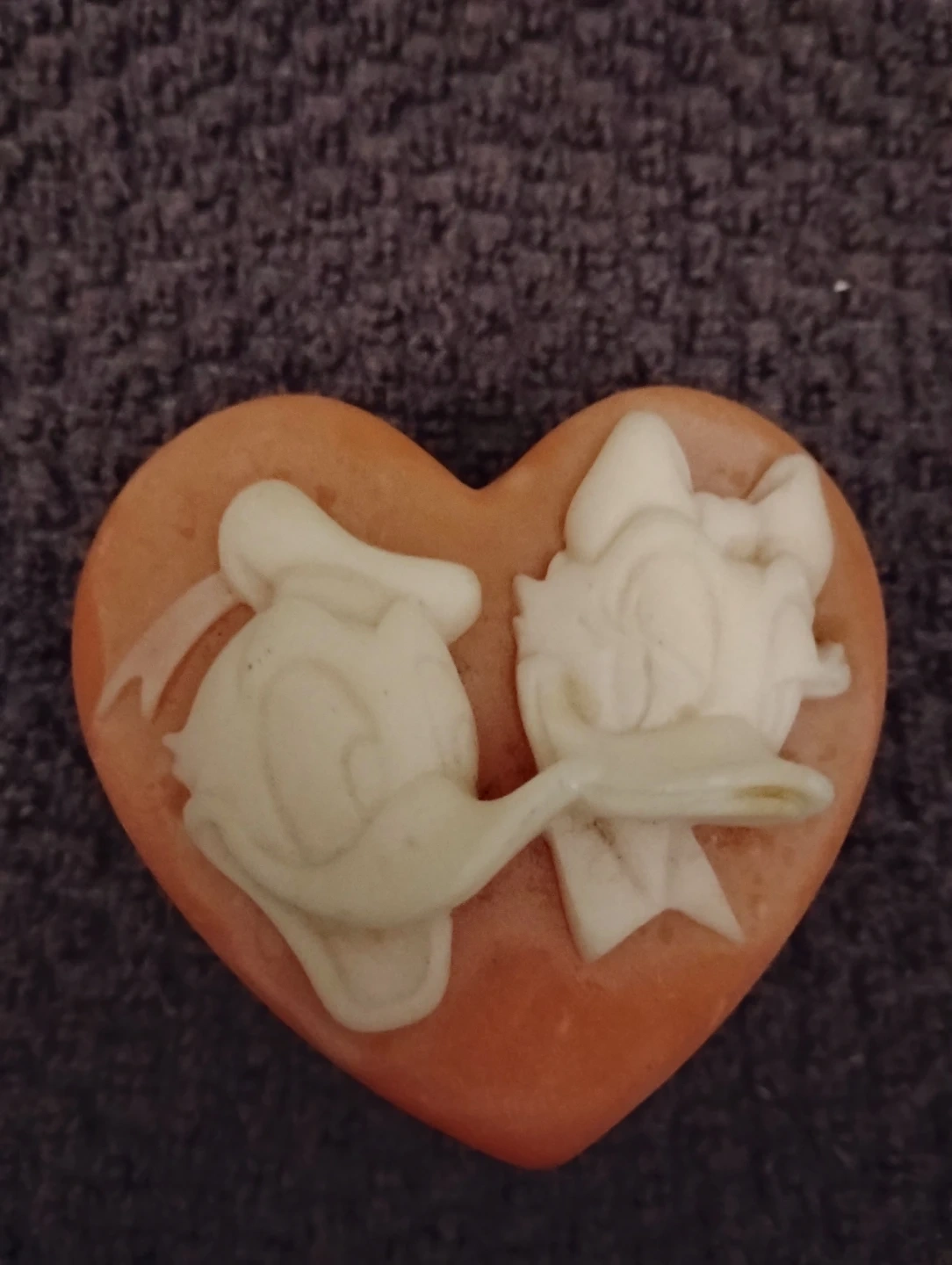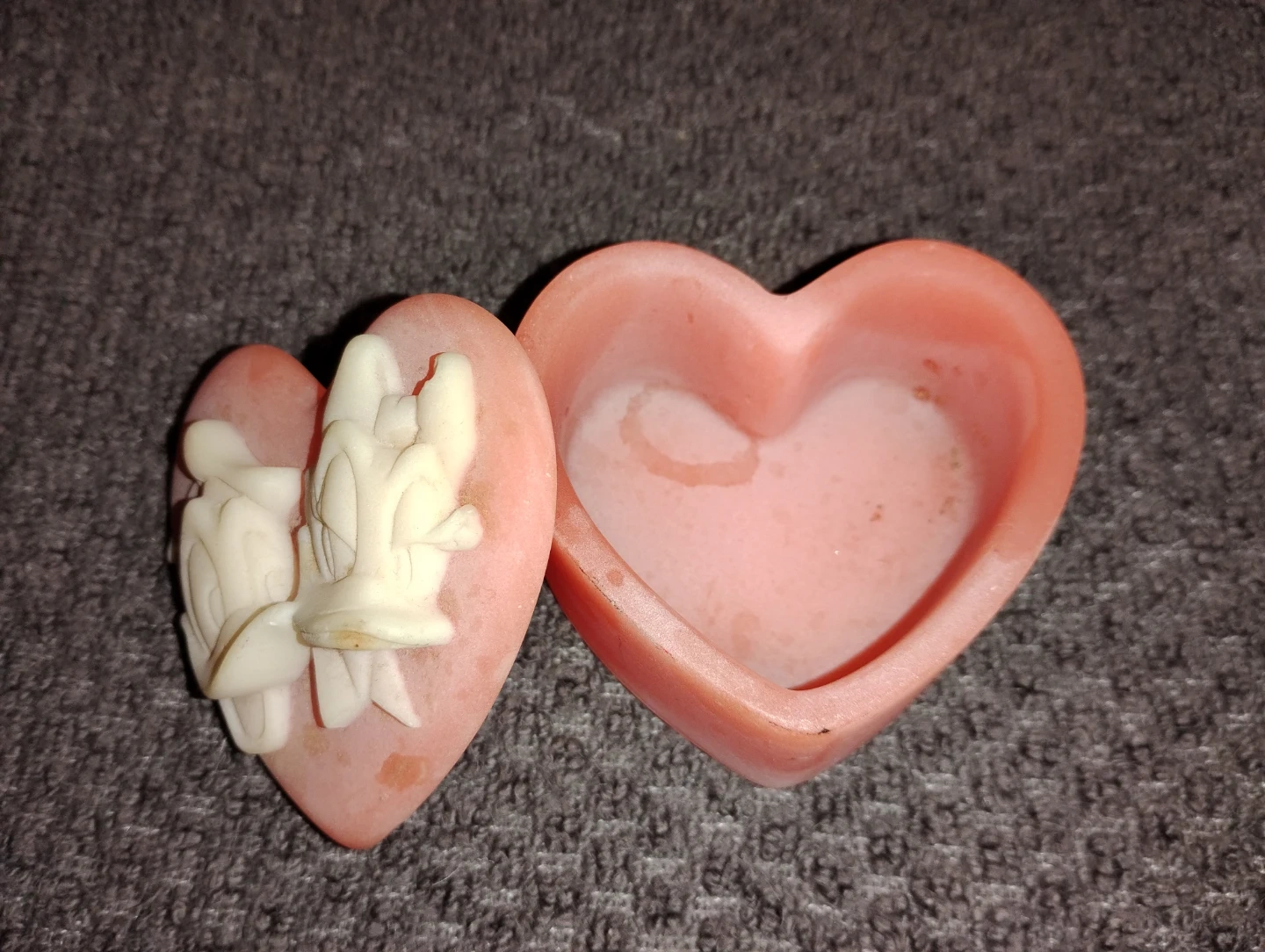 VINTAGE!! DONALD & DAISY PINK STONE HEART TRINKET BOX. MADE IN THE 70S. 3 INCHES WIDE BY 2 INCHES TALL APPROX. HAS BEEN IN A BOX FOR YEARS, COULD USE A BIT OF A CLEAN OF THE LID, BUT OTHERWISE IN LIKE NEW CONDITION. PERFECT TO KEEP SMALL JEWELRY IN!