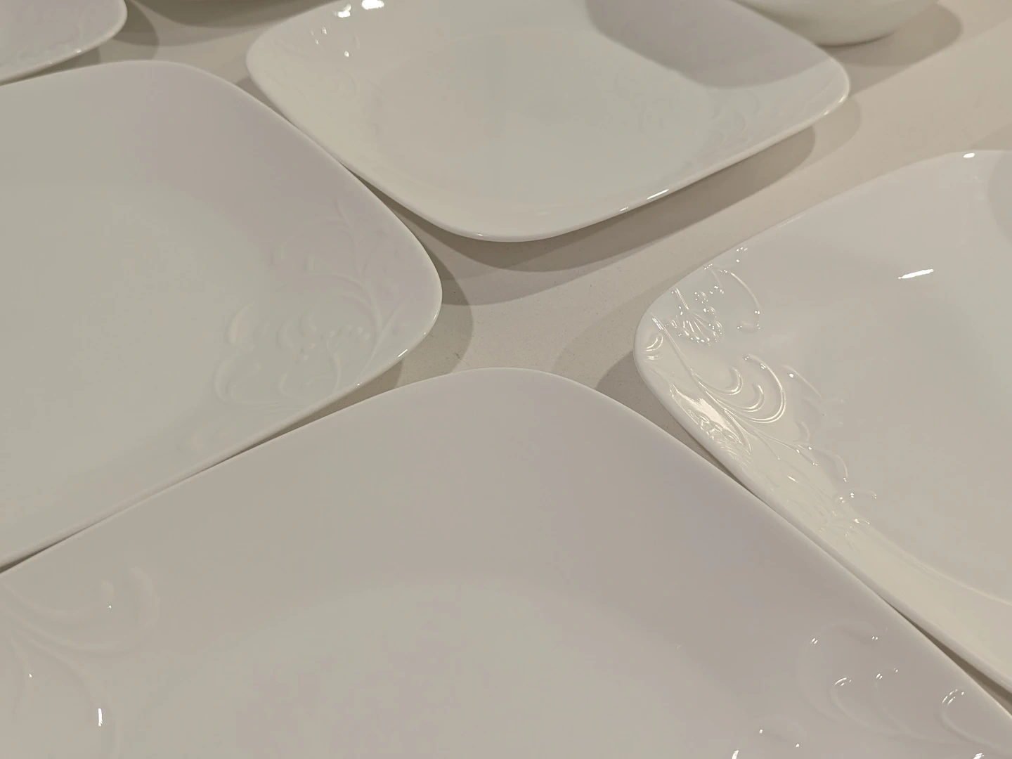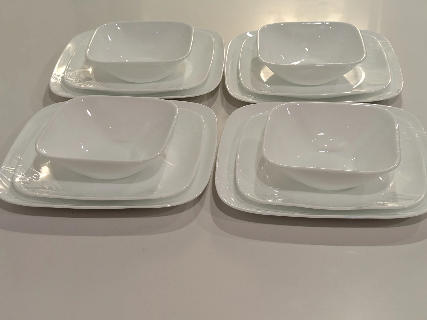 Selling a Corelle square white dinnerware set. Includes 4 dinner plates, 4 salad plates and 4 bowls. These are lightweight and durable, perfect for everyday use! They have a simple, elegant design that fits any table setting.