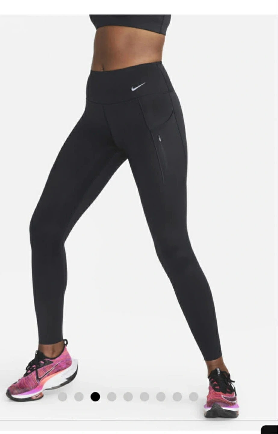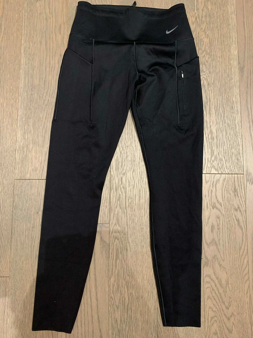 Selling a pair of black Nike running leggings. They feature a small Nike logo and a zippered pocket on the side. Great for running or working out!