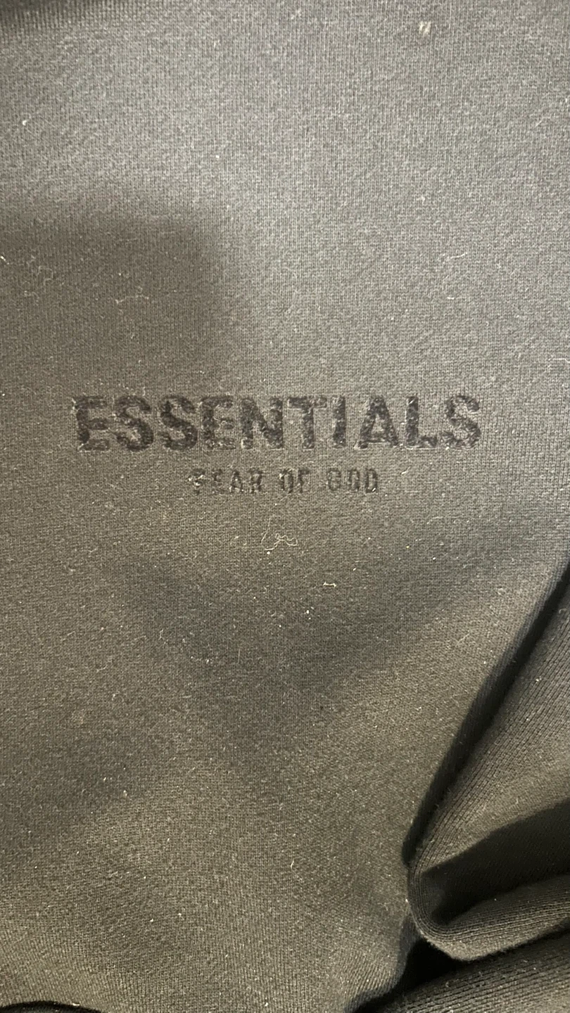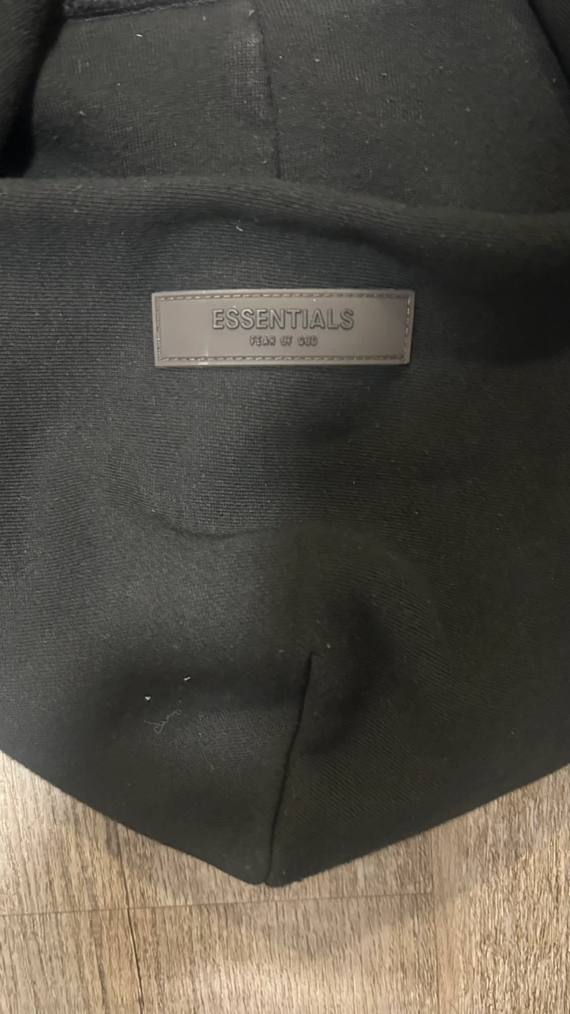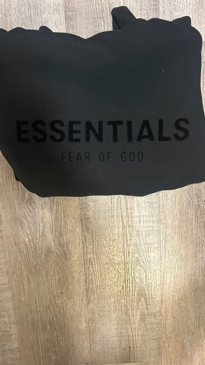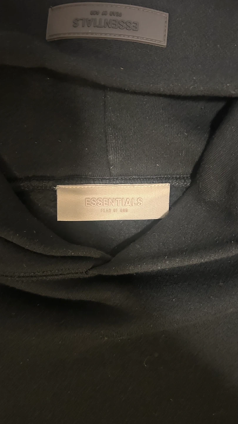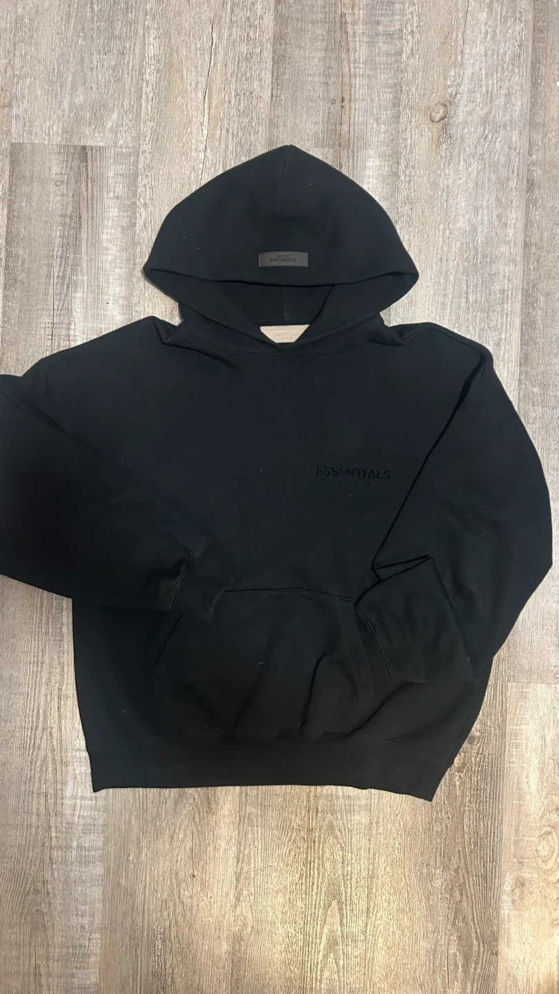 Selling a black hoodie from Essentials Fear of God. It's in great condition and has the brand name subtly printed on the front. This hoodie is super comfortable and stylish, perfect for everyday wear!