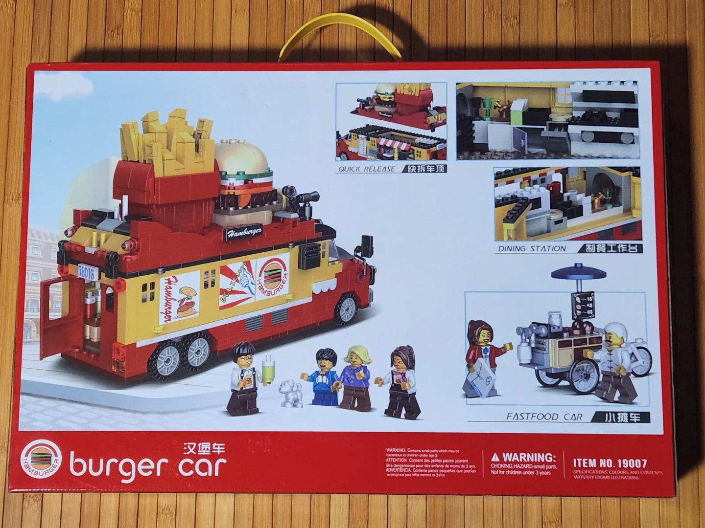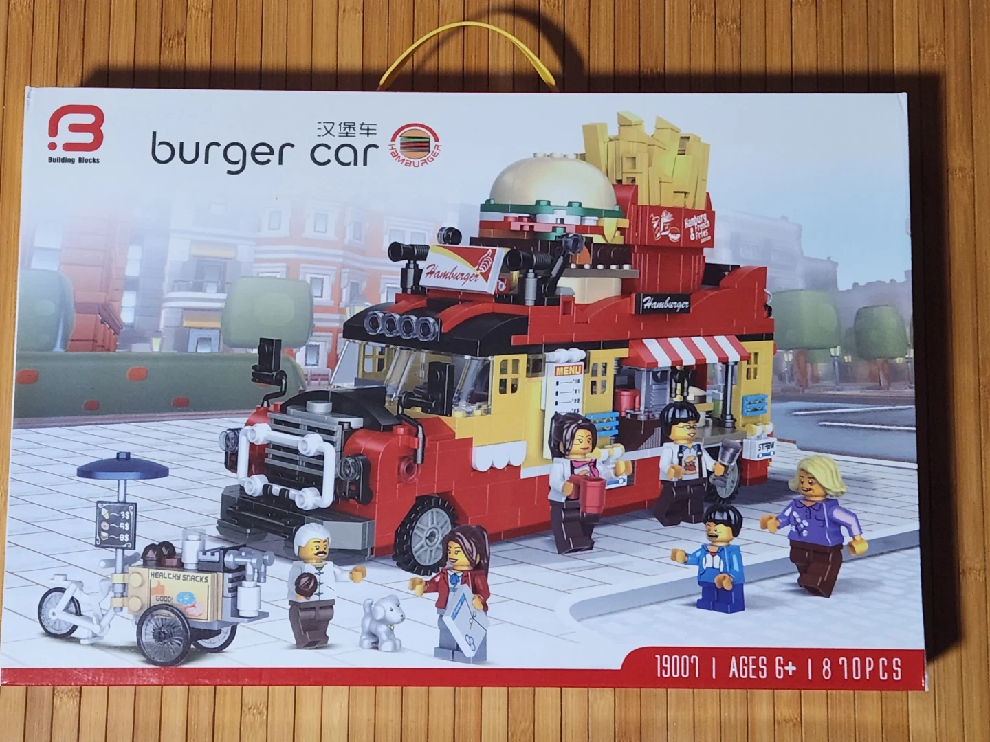 Brand new burger car food truck building blocks set! This set includes 1810 pieces and is recommended for ages 6+. Get ready to build your own burger car and fast food cart
