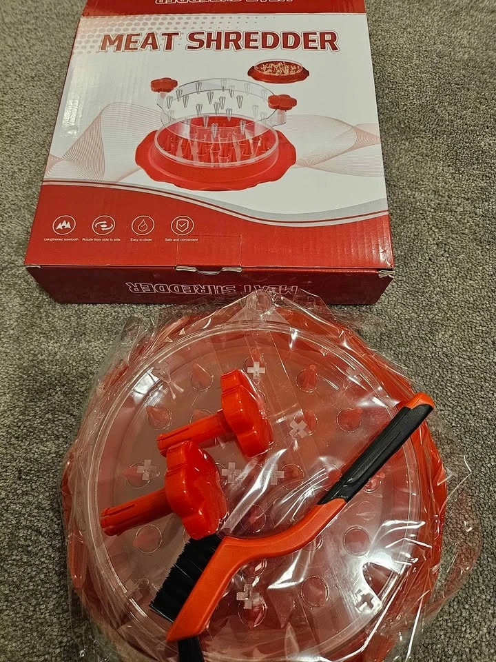 Brand new chicken shredder tool. Large size, great for chicken breasts, pork, and beef. Comes with a brush and fork. Features a visible shredder, anti-slip strip, and ergonomic handle. BPA free. From a pet-free and smoke-free home. Let me know if you're interested!