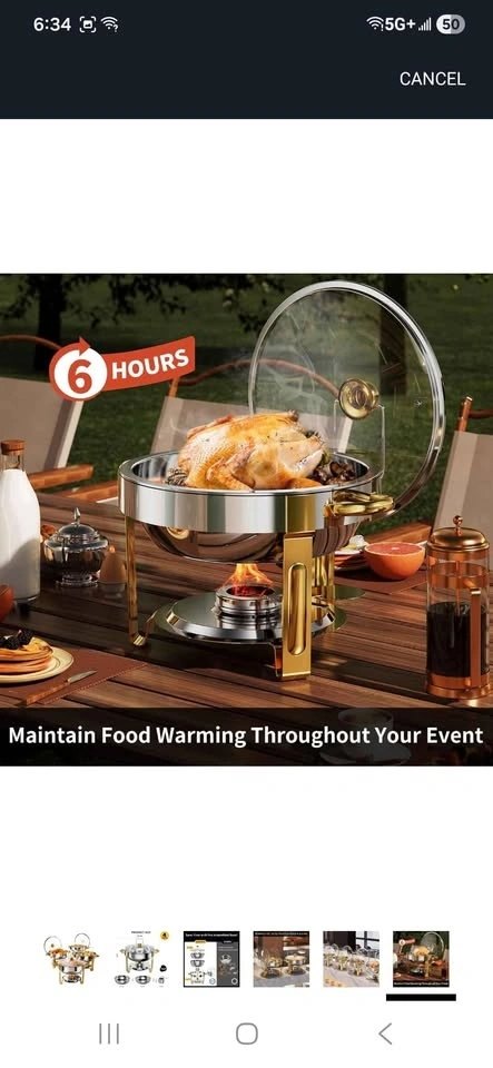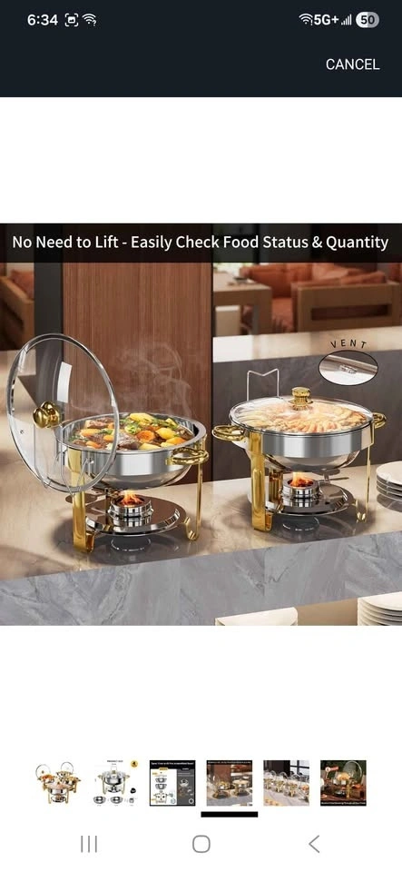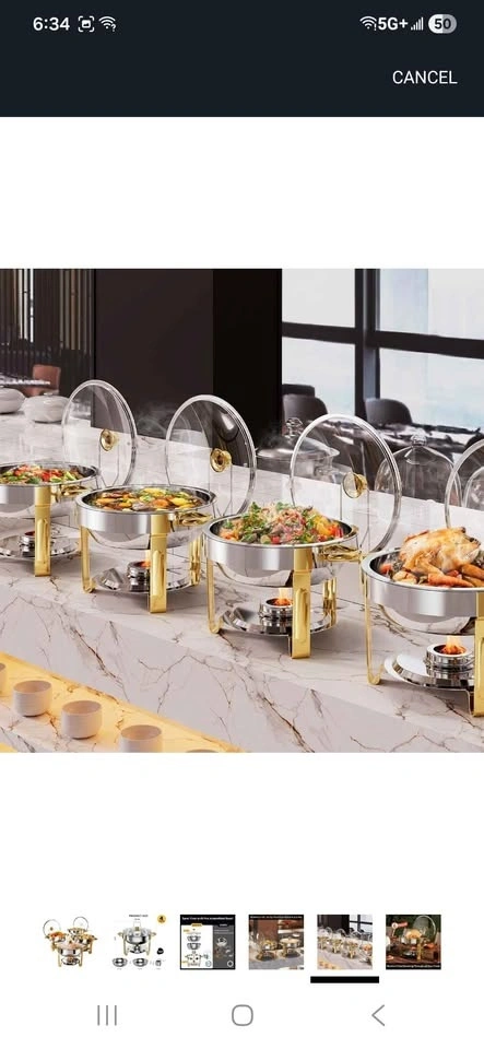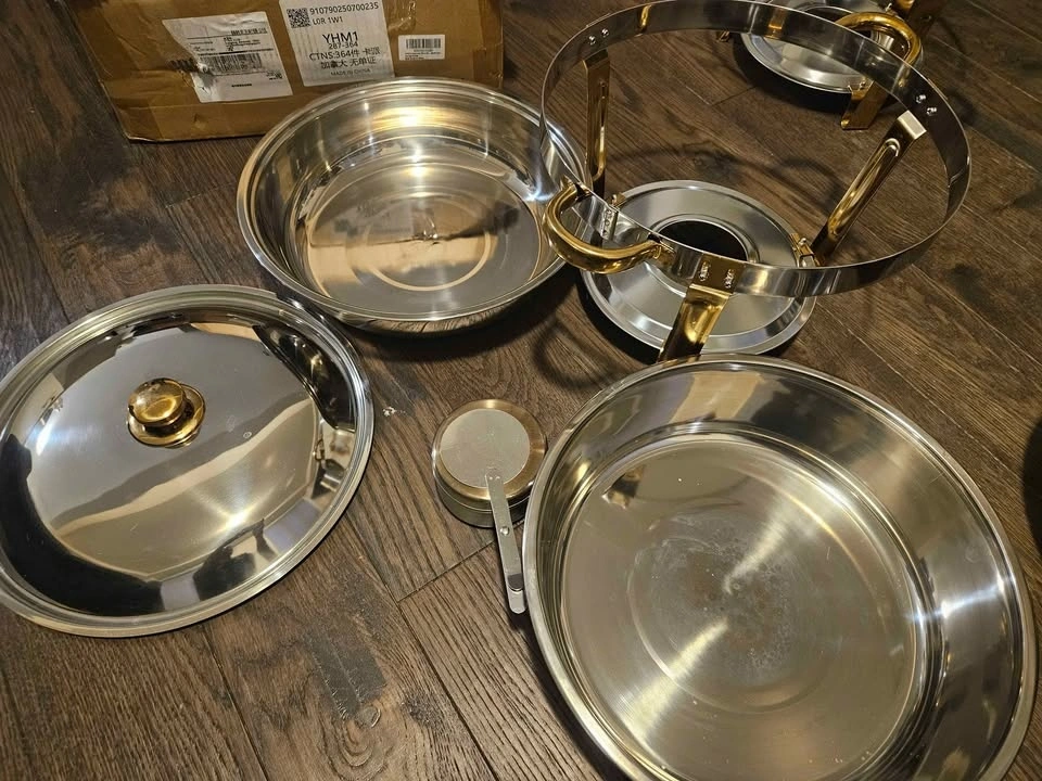Brand new set of 4, 5QT round chafing dishes with glass lids and lid holders. Stainless steel food warmers, perfect for parties, catering, or weddings. From a pet-free and smoke-free home. Can be delivered based on my availability.
