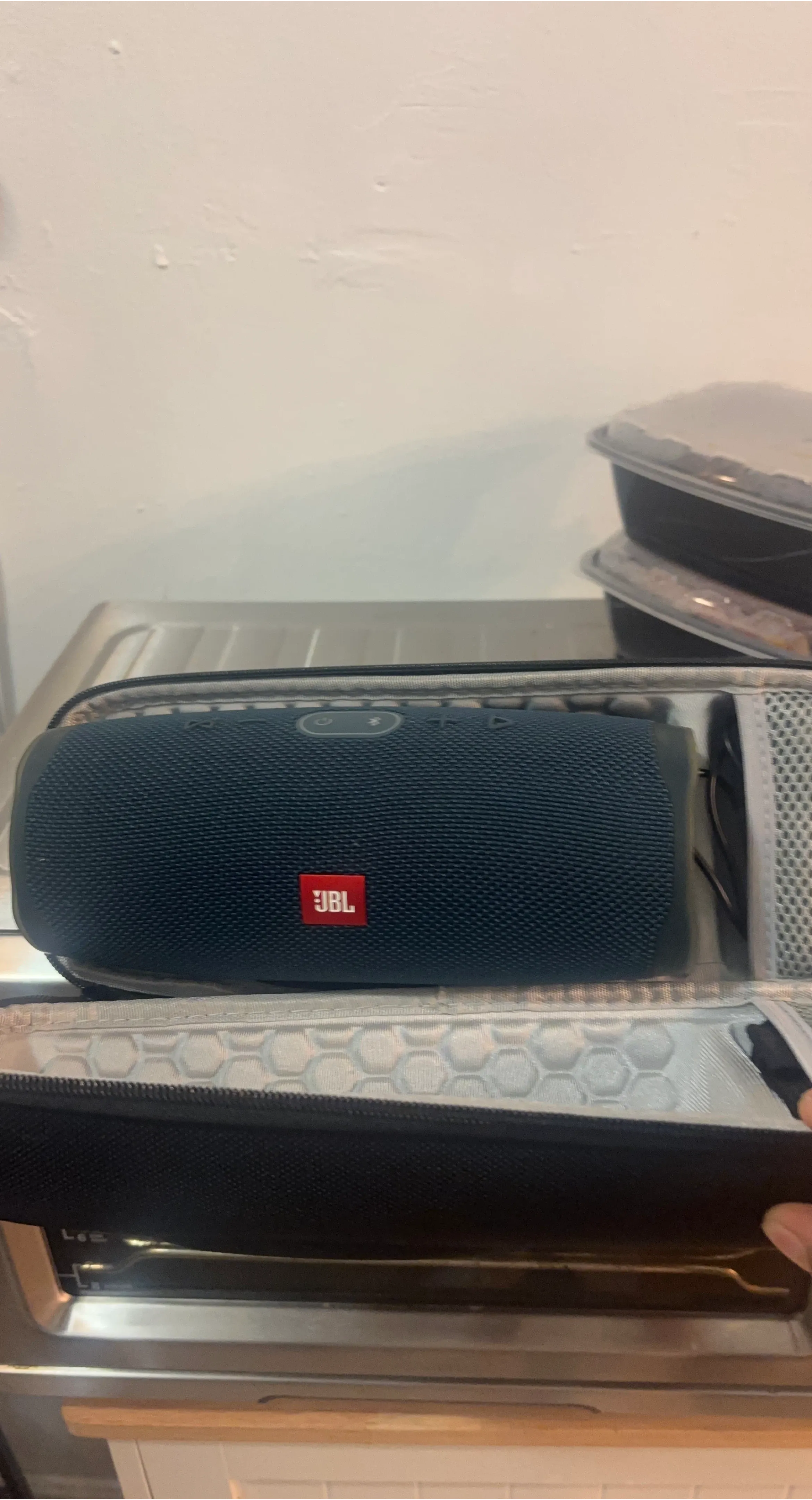 Selling a blue JBL Charge 4 Bluetooth speaker! It's in great condition and comes with a case. This speaker is perfect for on-the-go listening, whether you're at the beach, park, or just moving around the house