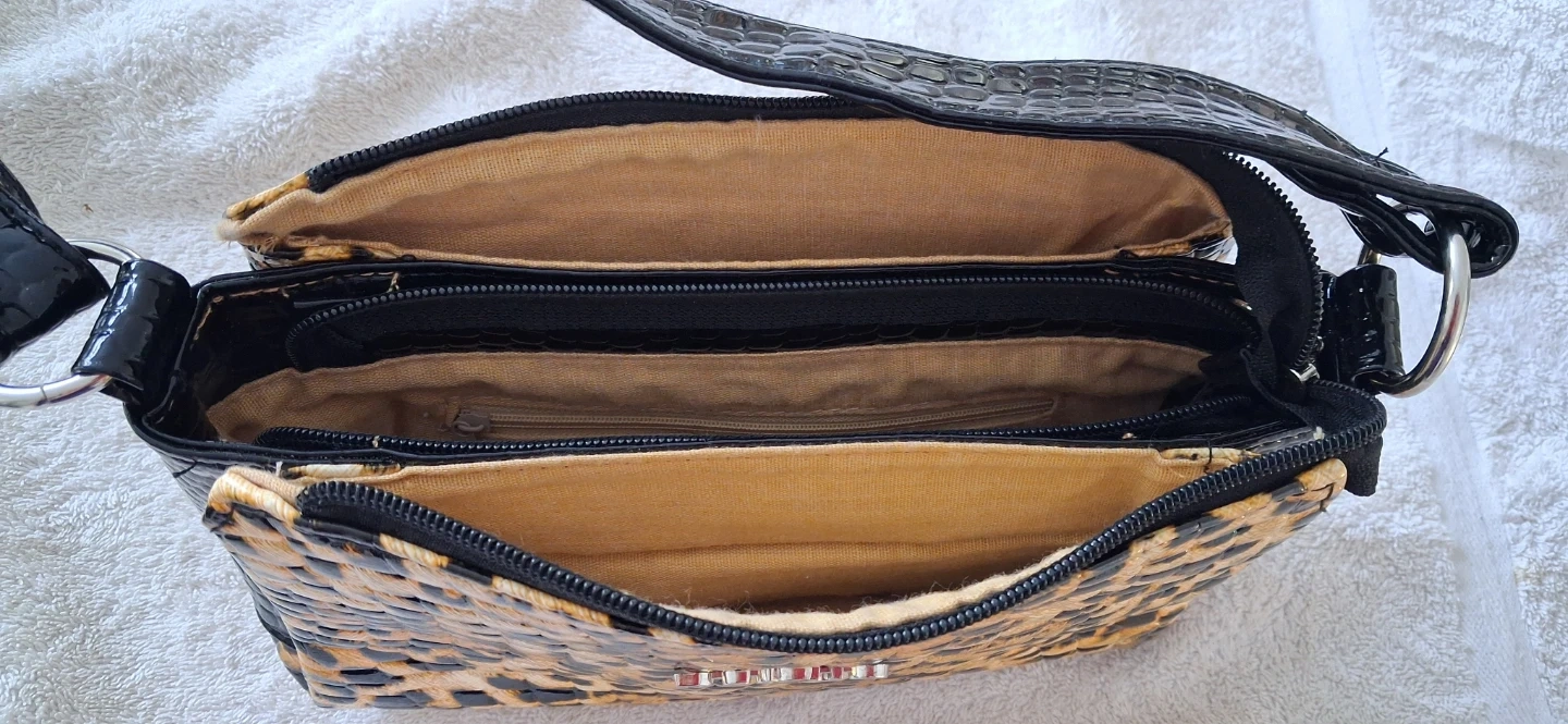 Selling this stylish shoulder bag! It features a fun leopard print on the front and a sleek black finish on the sides and strap. It's in great condition and ready for a new home