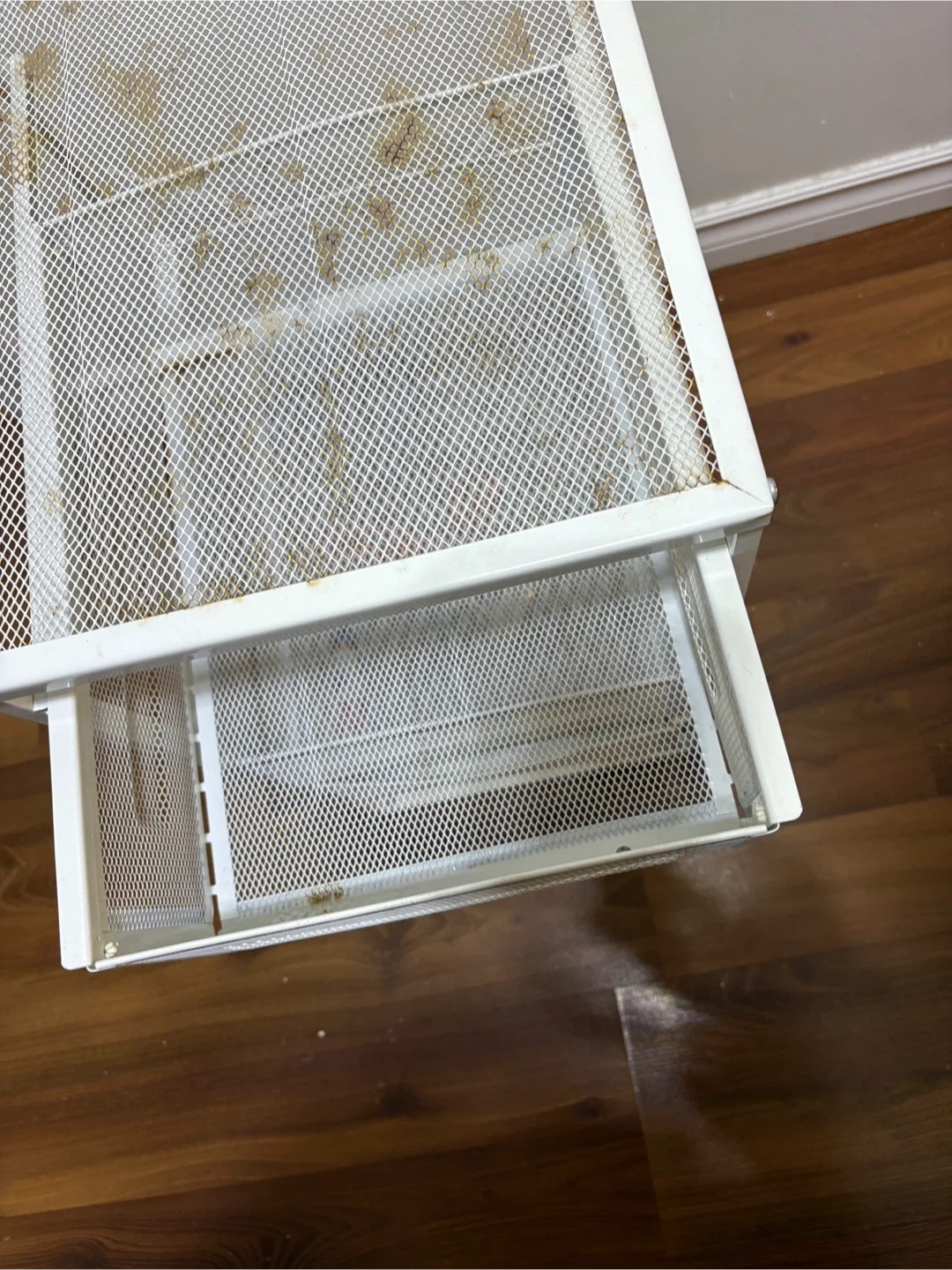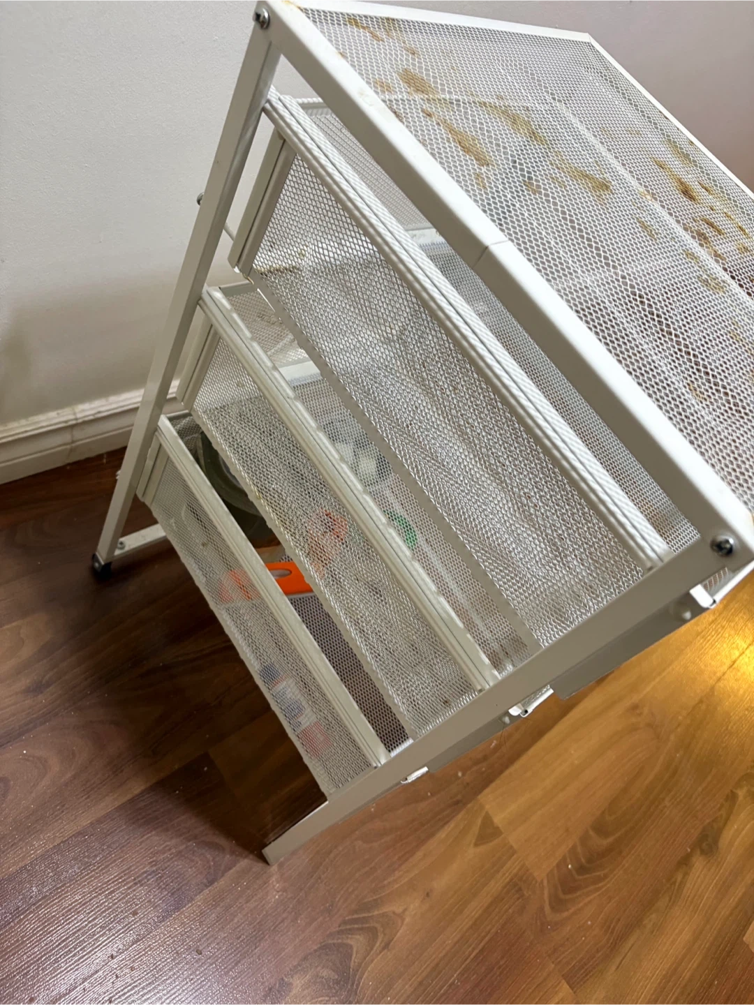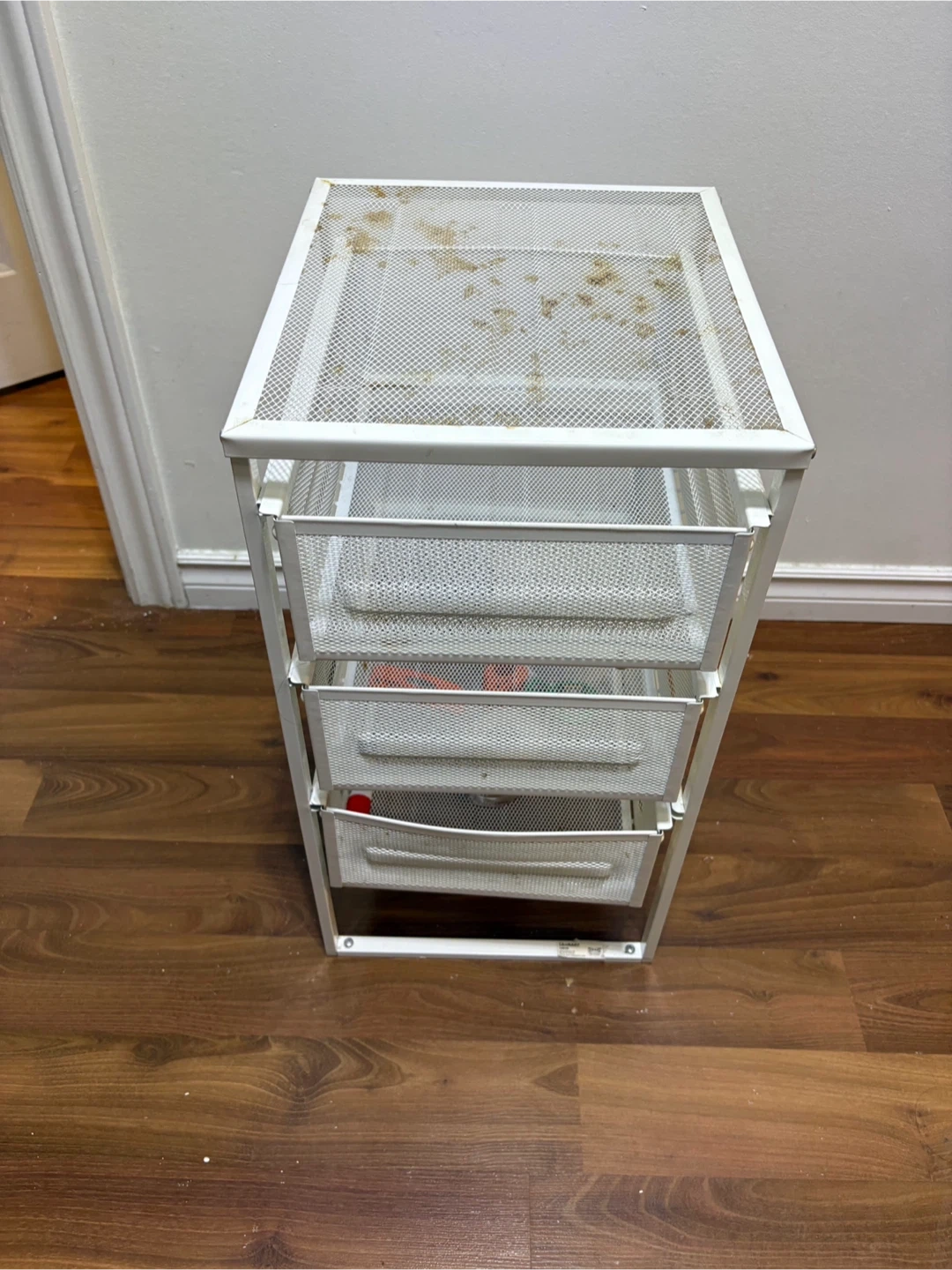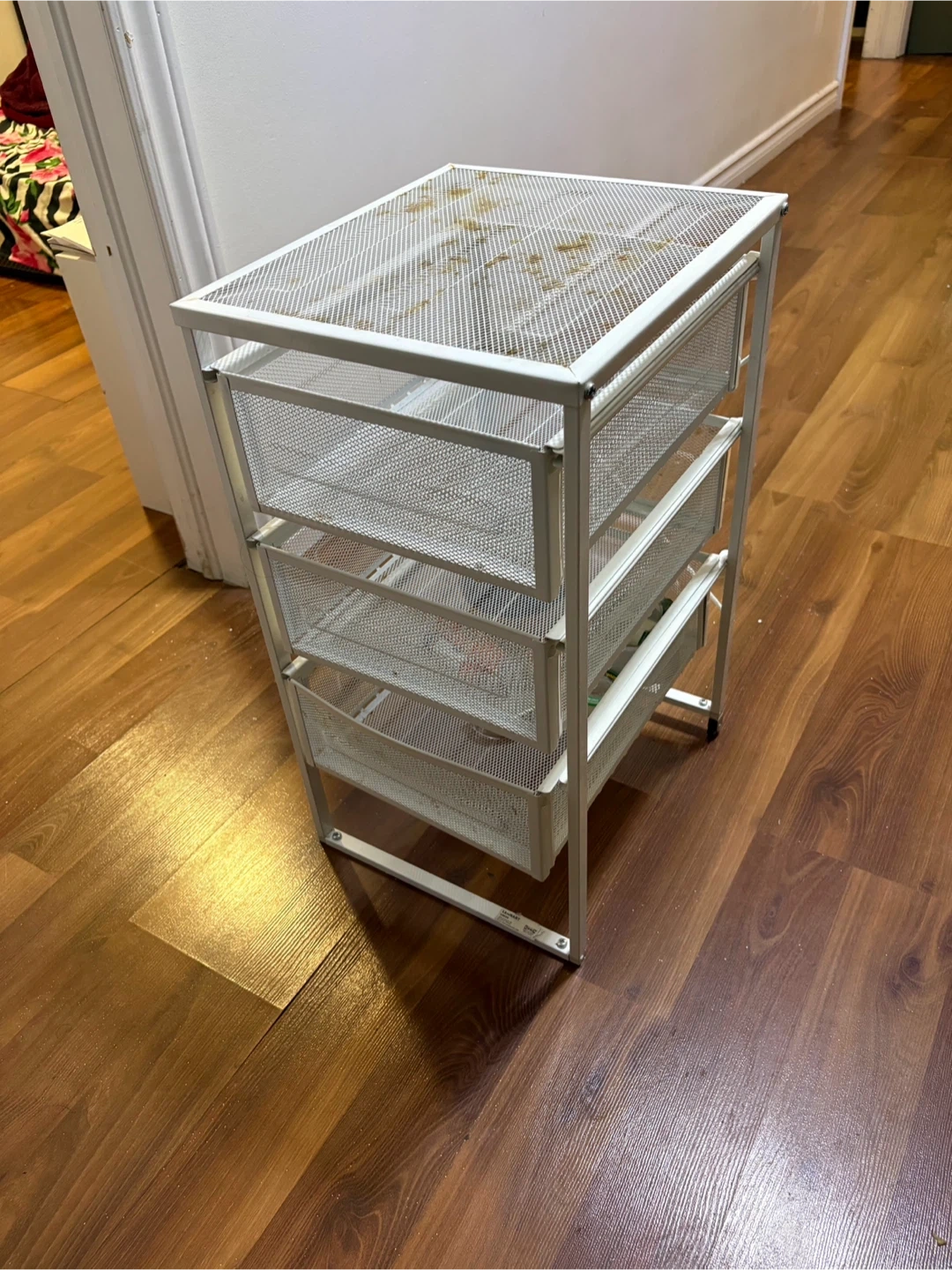 Selling a white metal mesh drawer unit. It has three drawers and is on wheels. It has some stains on the top.