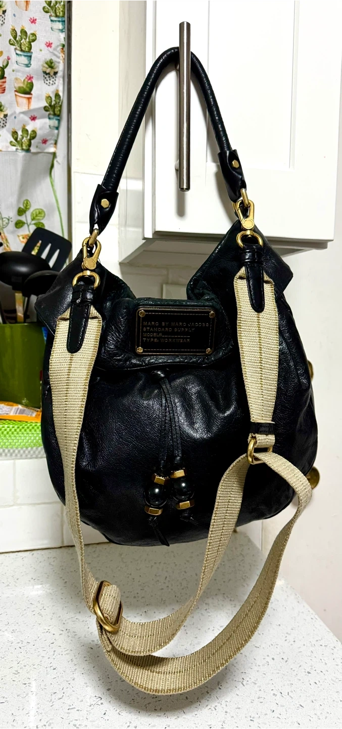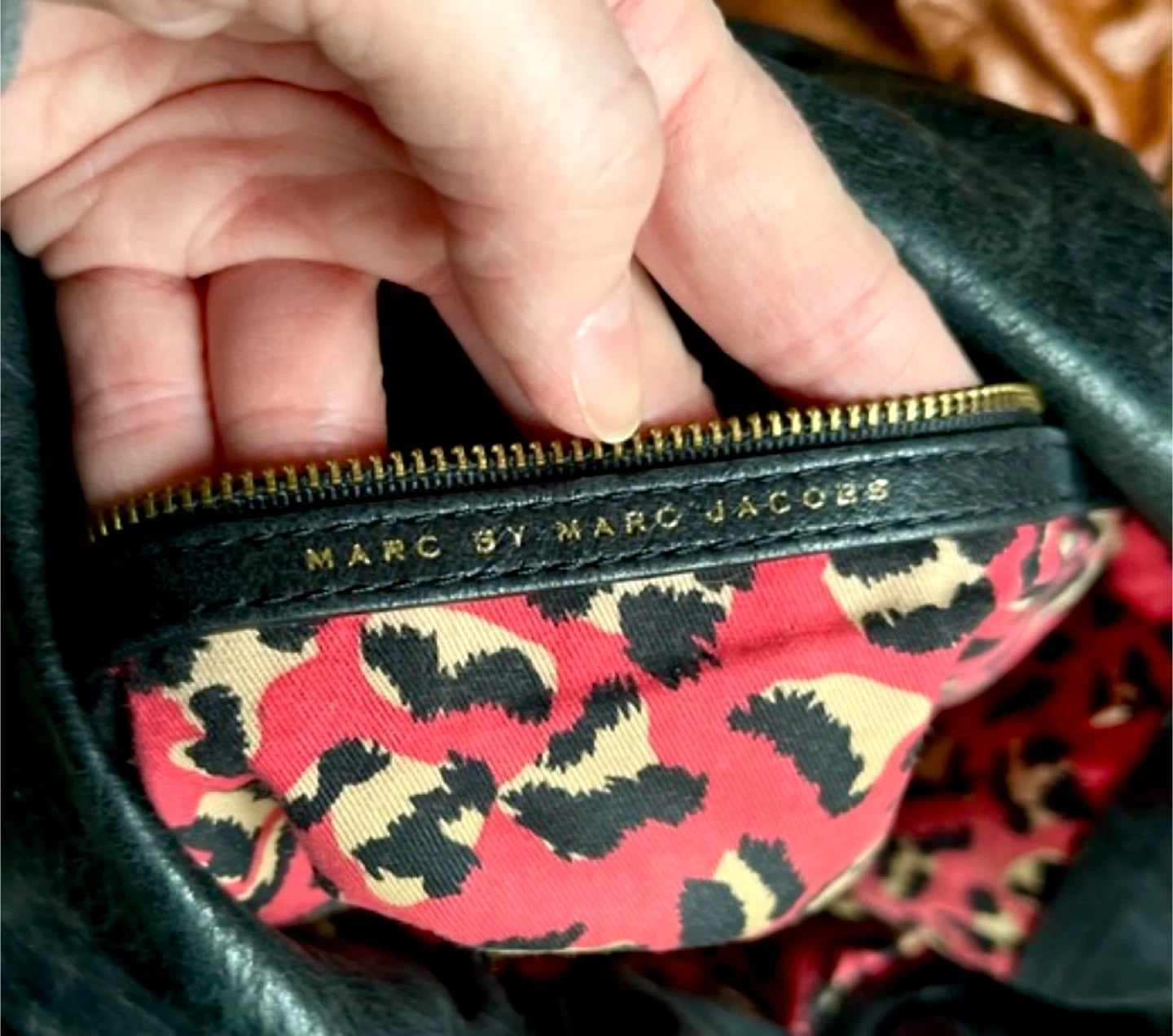 A favorite, Marc by Marc Jacobs black leather Q Hiller hobo bag with magnetic closure at top, gold accents and a red leopard print inside.