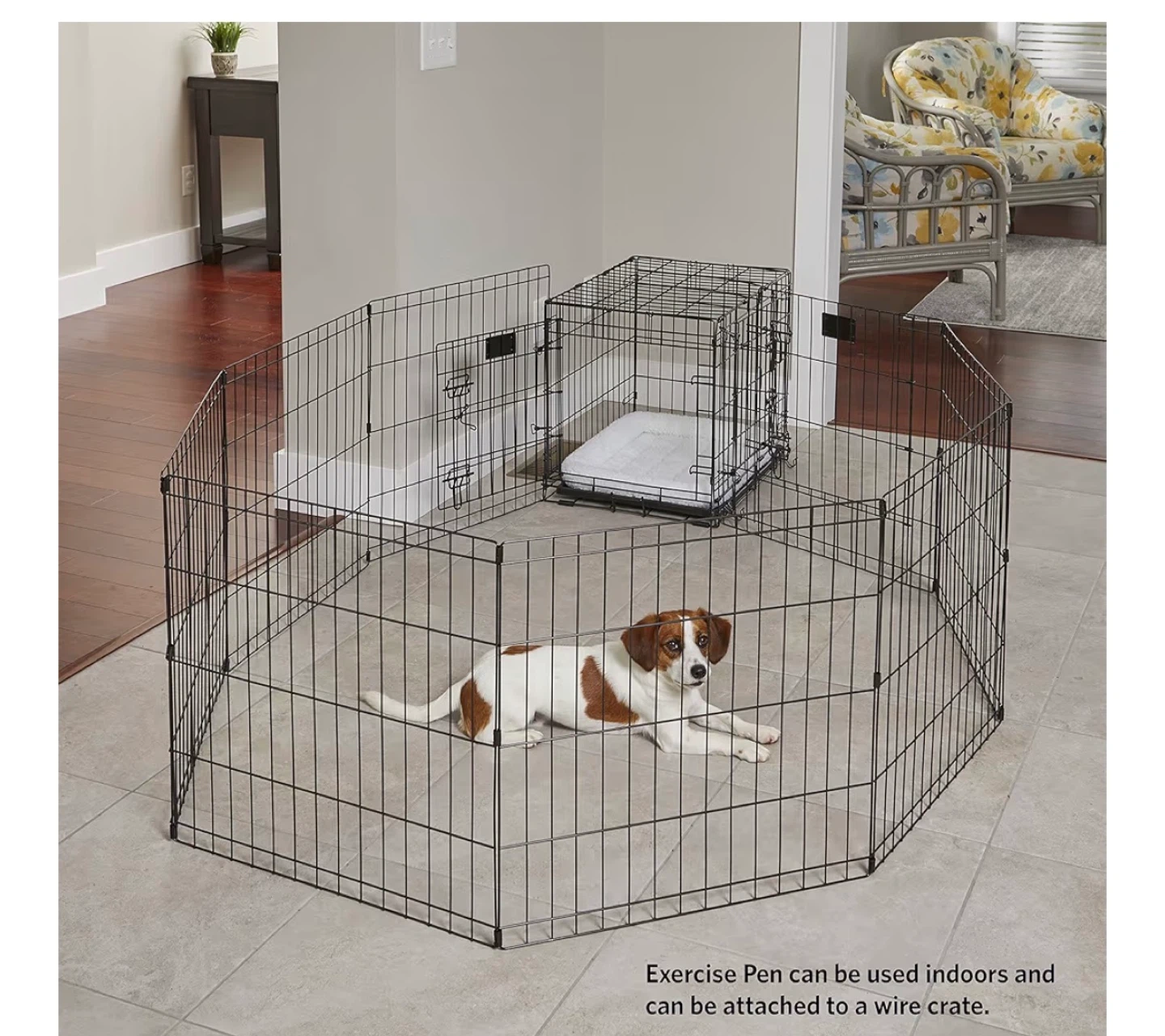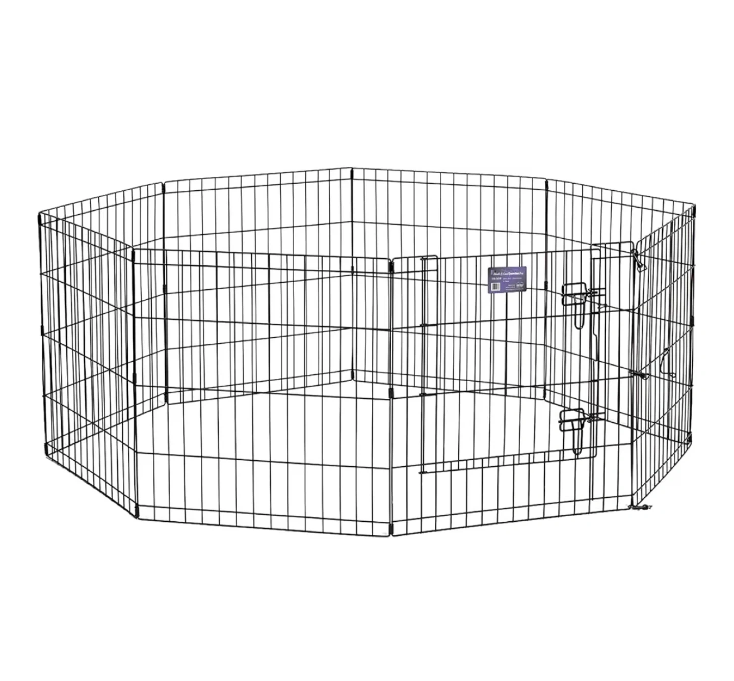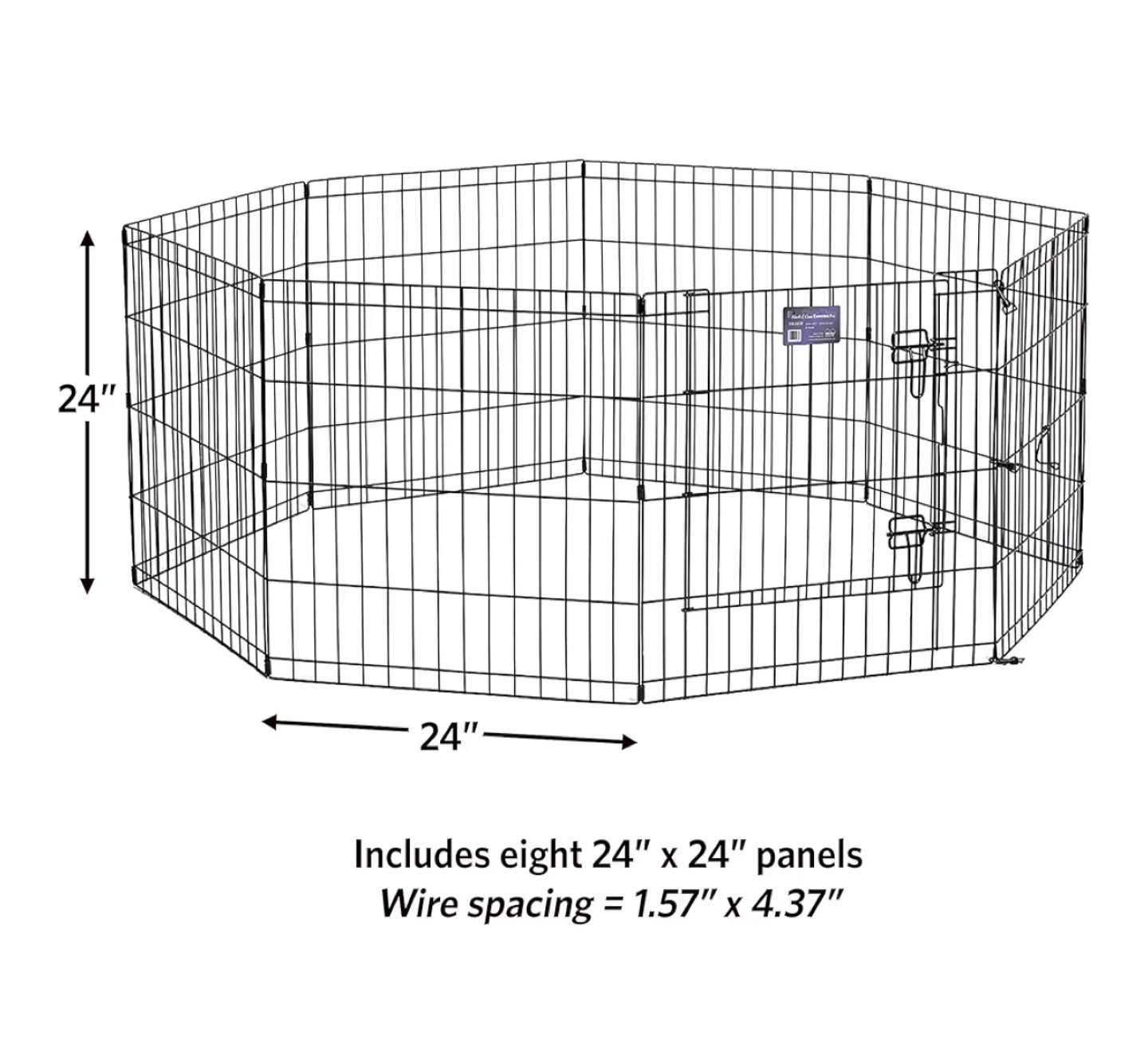 Selling a used exercise pen, perfect for indoor or outdoor use for your furry friend! It can also be attached to a wire crate. Each panel is 24" x 24", and there are eight panels in total. Wire spacing is 1.57" x 4.37".