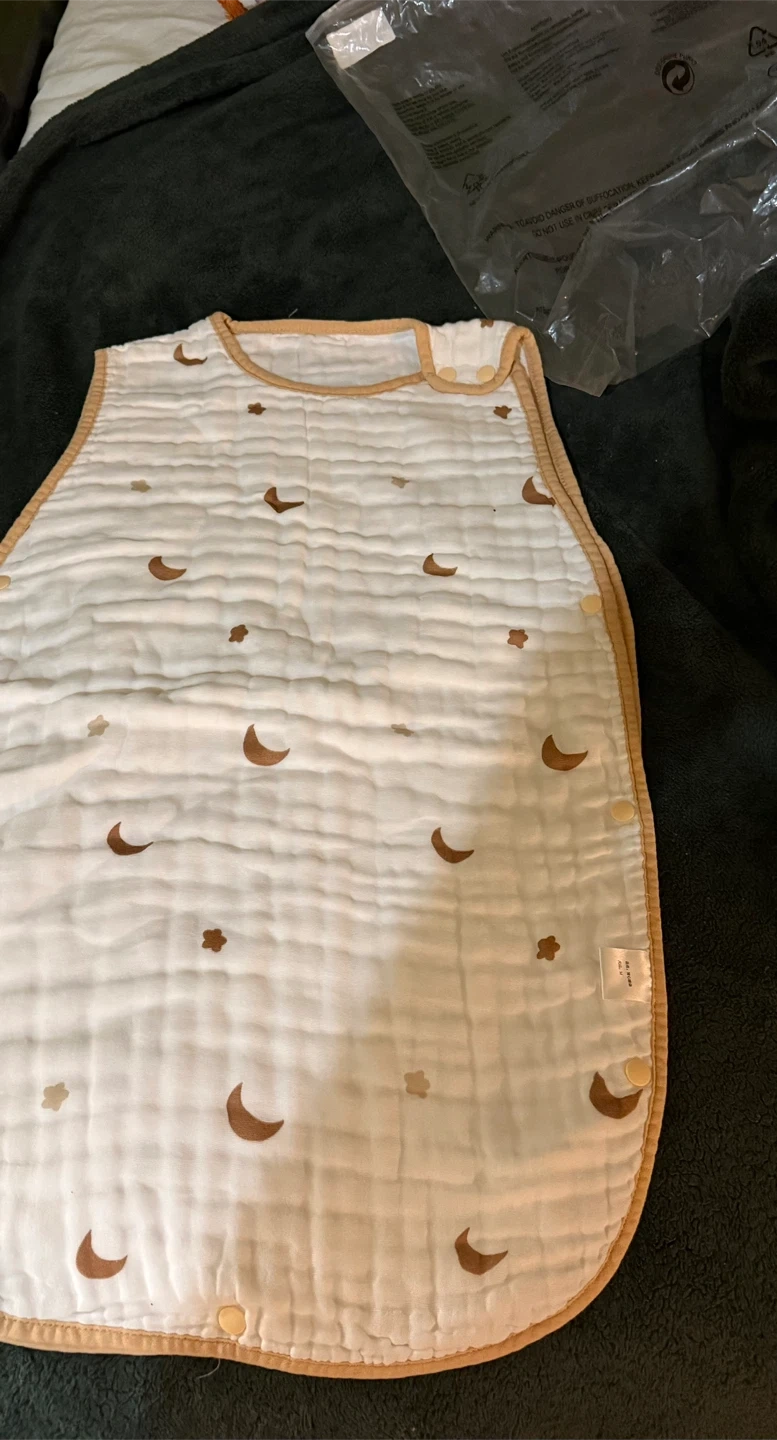 This muslin sleeping sack is perfect for keeping your little one cozy and comfortable! It features a cute moon and star pattern. The sack is in great condition and comes in its original packaging