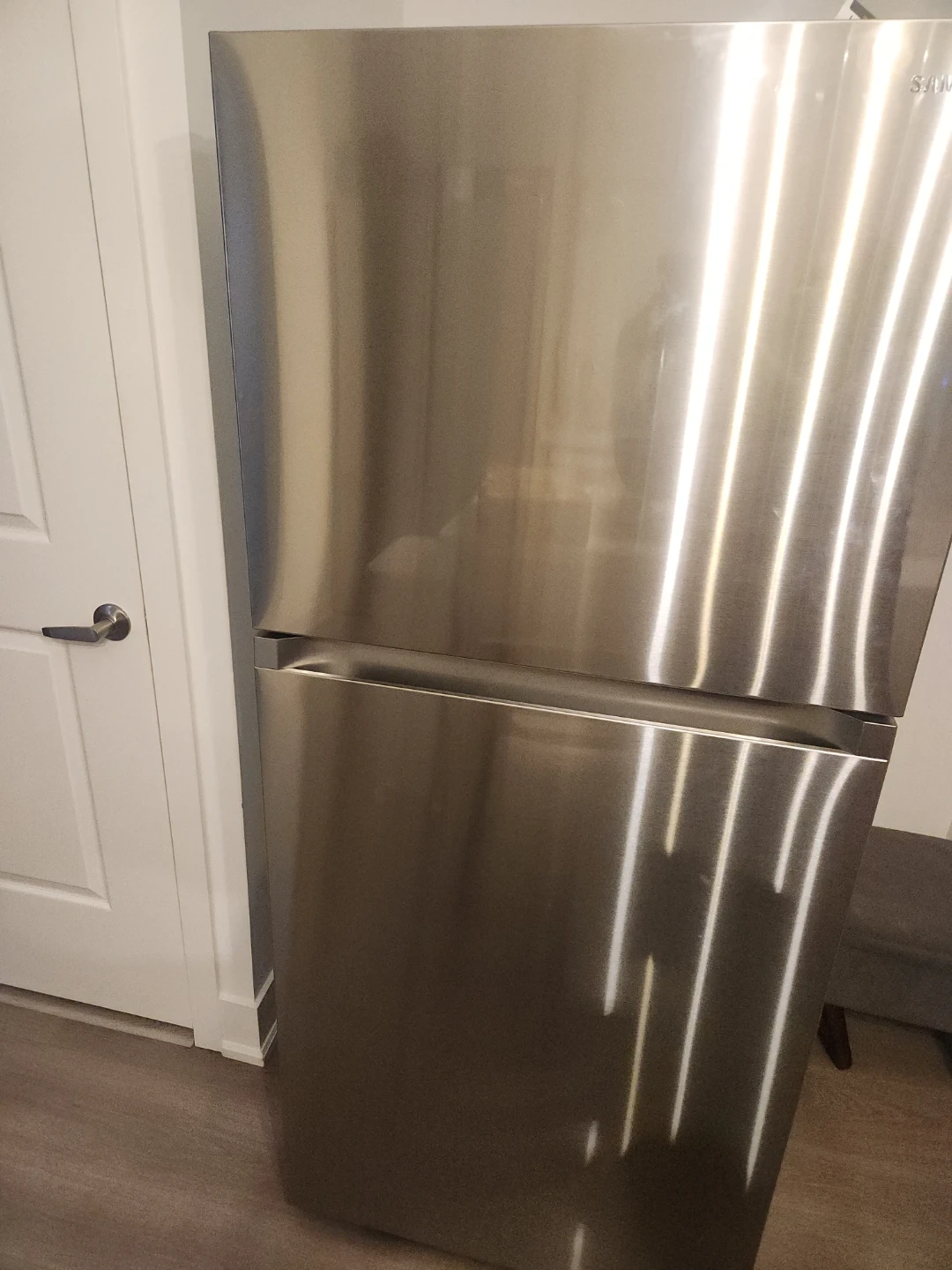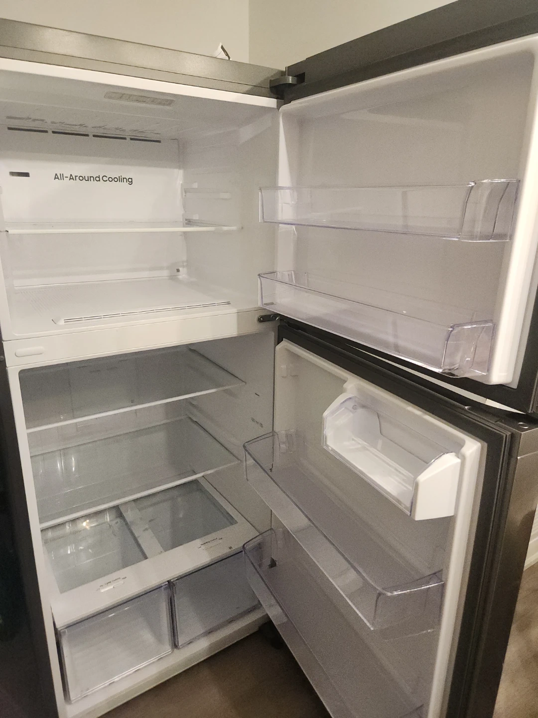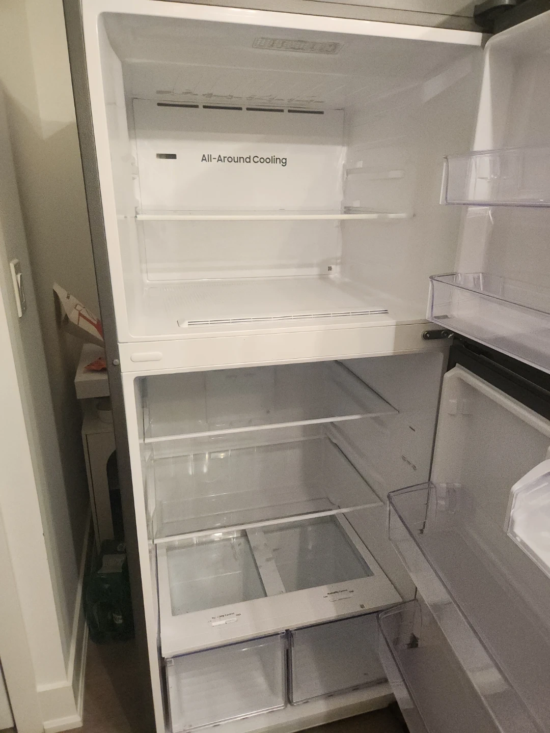 Selling a Samsung refrigerator in stainless steel. It features All-Around Cooling to keep your food fresh. The interior is clean and well-organized with adjustable shelves and door bins. Just used for 10 months.