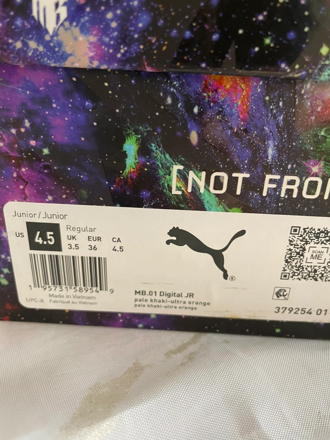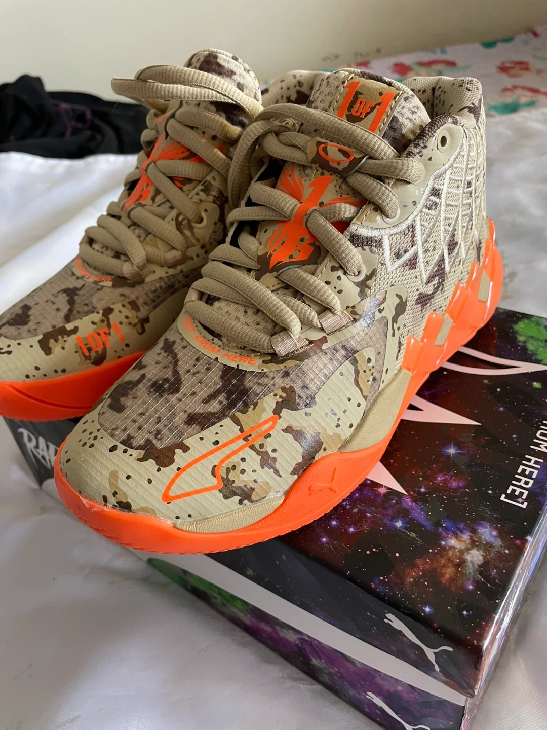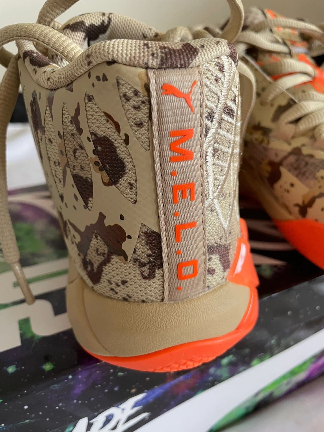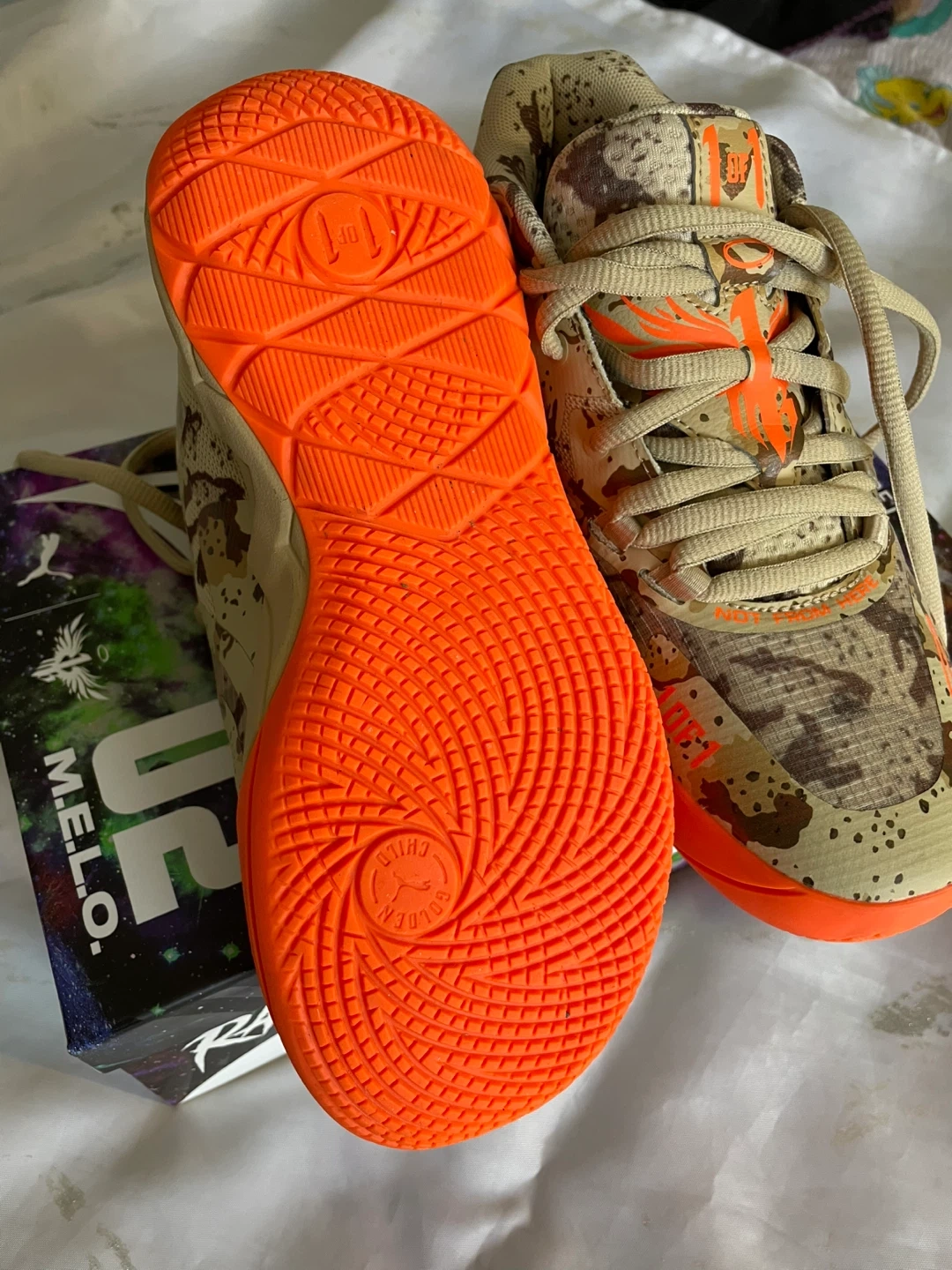 Selling a pair of Puma Melo Rare Reserve basketball shoes in a US size 4.5 Junior. These shoes feature a unique camo pattern with vibrant orange accents. They come with the original box, making them perfect for any basketball enthusiast or sneaker collector! Sorry there is no receipt.