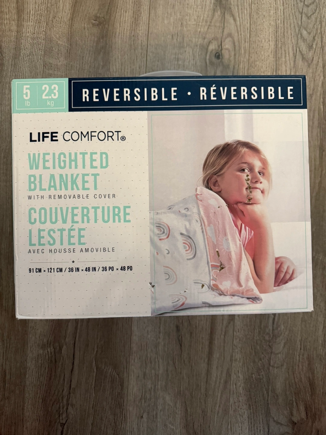 Selling a Life Comfort weighted blanket! It's reversible and comes with a removable cover. The size is 91 cm x 121 cm, which is about 36 inches x 48 inches. Brand new. Pick up by the Eaton Center $30