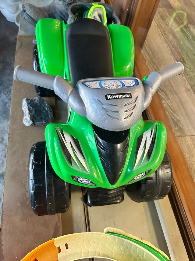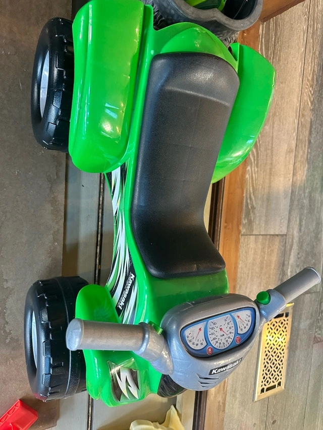 This is a Kawasaki Kids ATV ride-on toy, perfect for young adventurers! It features a vibrant green design and sturdy construction for hours of fun. It is in used, but good condition. Makes vroom noise with buttons. I'm downsizing my kids' collection of ride-on toys, and this ATV is ready for a new home. It's been well-loved and is ready for its next adventure. If the ad is up, the ATV is available for pickup! From smoke and pet free home. Cash accepted.