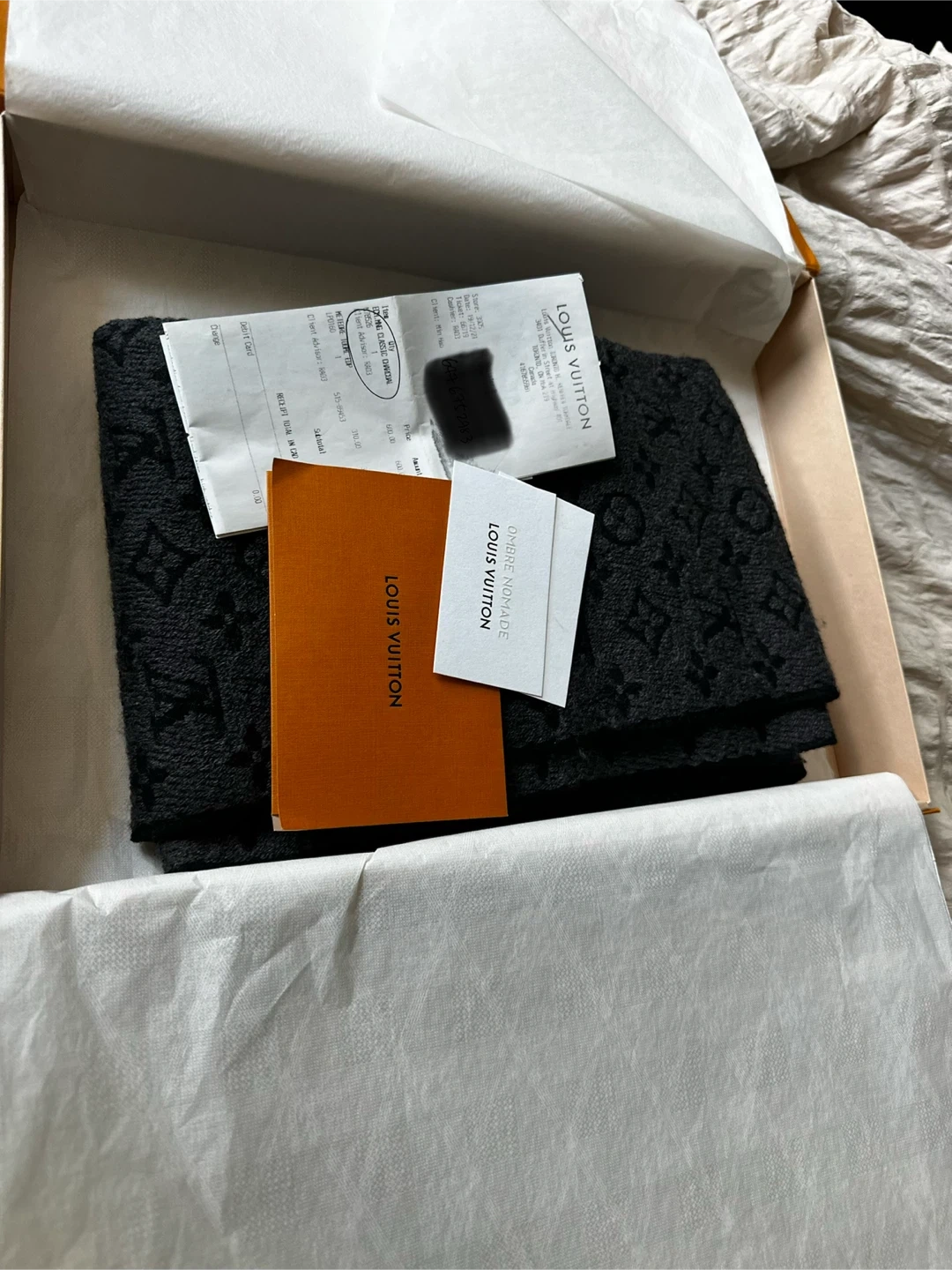 Selling a Louis Vuitton Echarpe Classic scarf in charcoal! It's in excellent condition and comes with the box. The receipt indicates that it was originally purchased for $600 CAD. A stylish and warm accessory for the colder months!