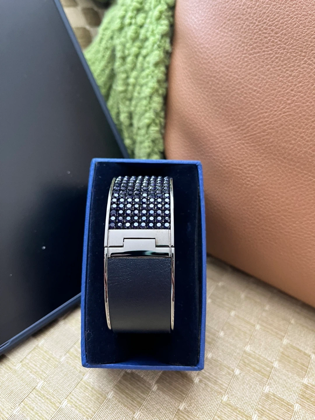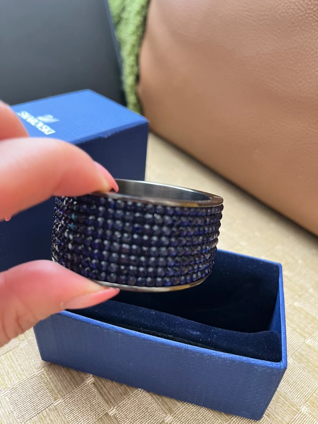Selling a beautiful Swarovski bangle bracelet. It features a row of sparkling blue crystals. Comes with its original box!