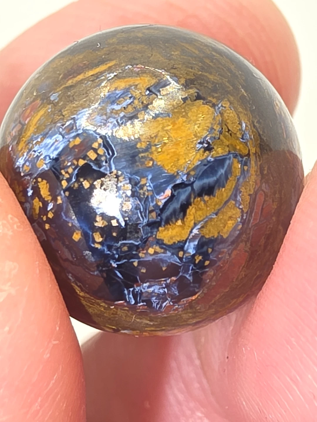 Here's a beautiful mini pietersite sphere! It has a lovely mix of blue and gold colours. Perfect for collectors or anyone who appreciates unique stones.