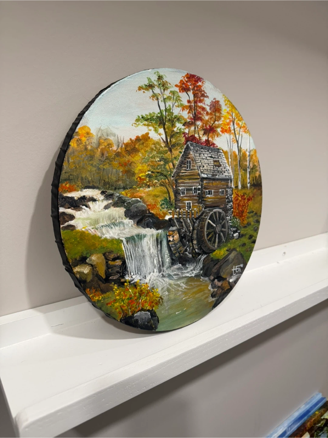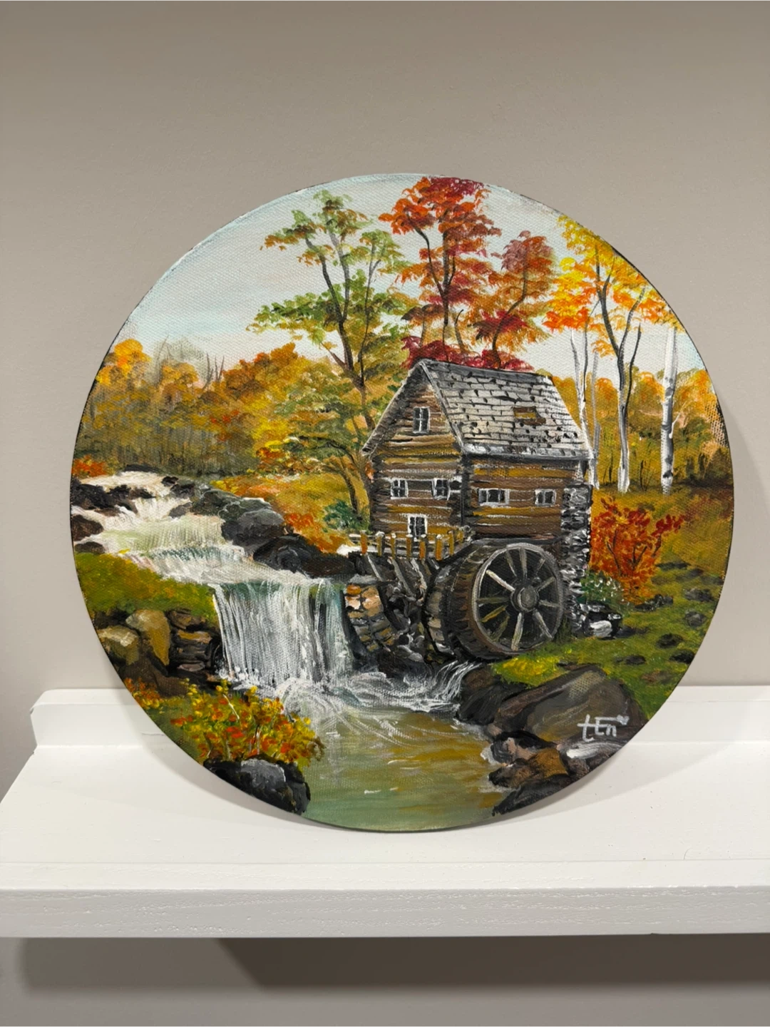 Autumn Watermill - 12” Round Original Acrylic Painting