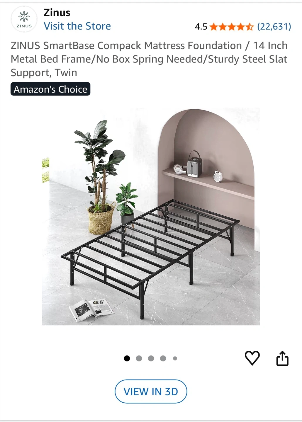 Selling a Zinus SmartBase 14-inch Metal Bed Frame (Twin Size) in excellent condition. This is a strong, minimalist, heavy-duty steel bed frame that does NOT require a box spring, making it a great value for students, renters, or anyone setting up a bedroom on a budget.