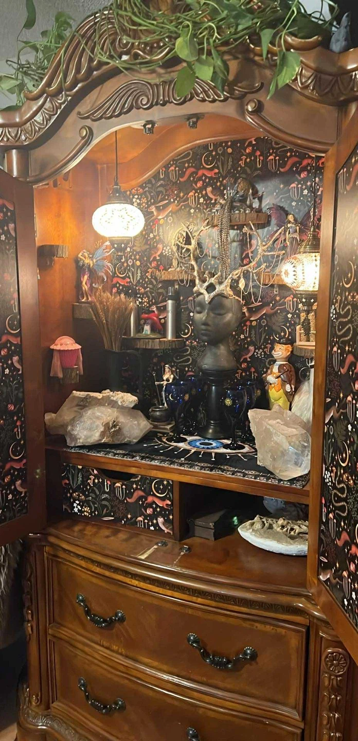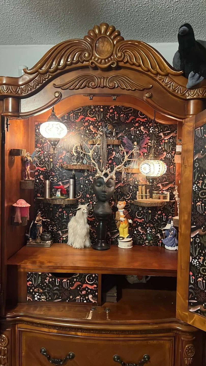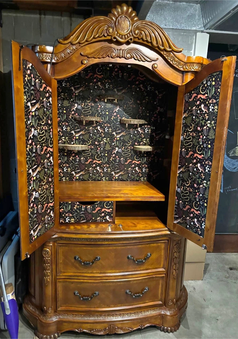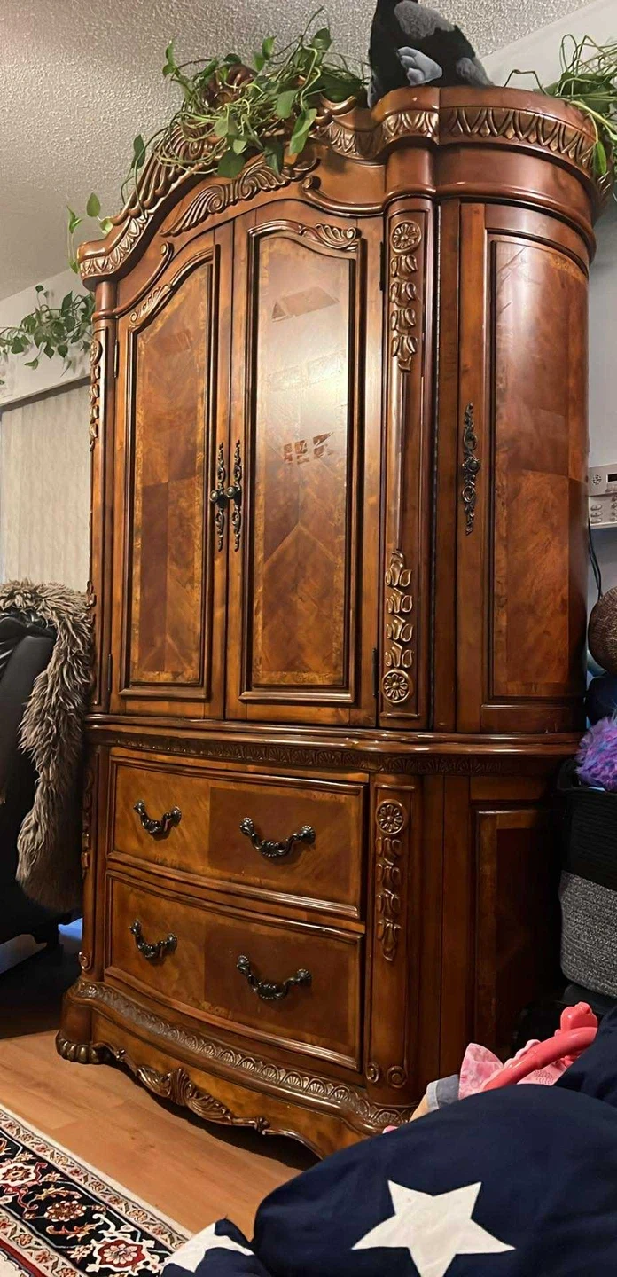 Selling a beautiful, ornate wooden armoire. It features a unique patterned interior and multiple shelves and drawers for storage. It's a stunning piece that would add character to any room!