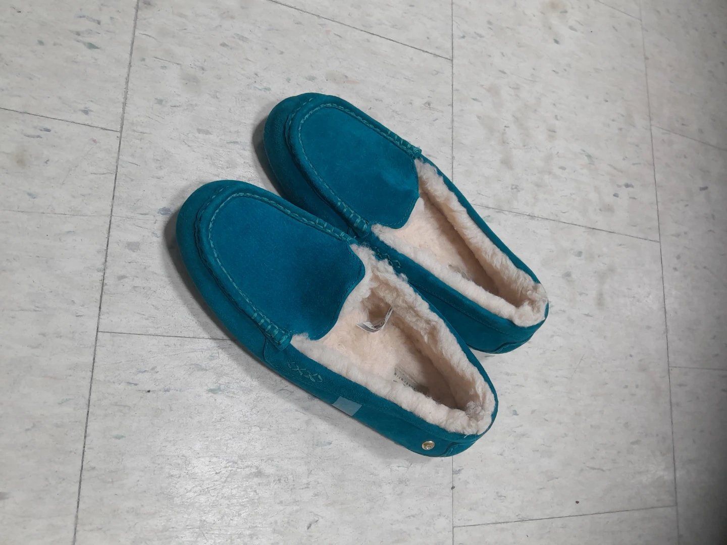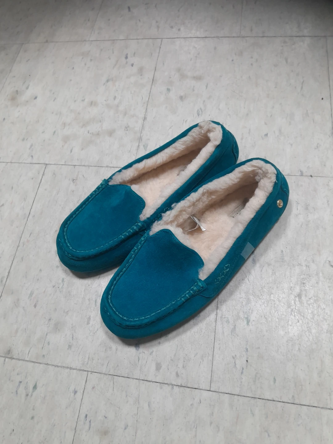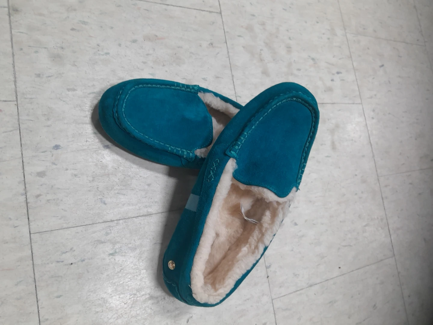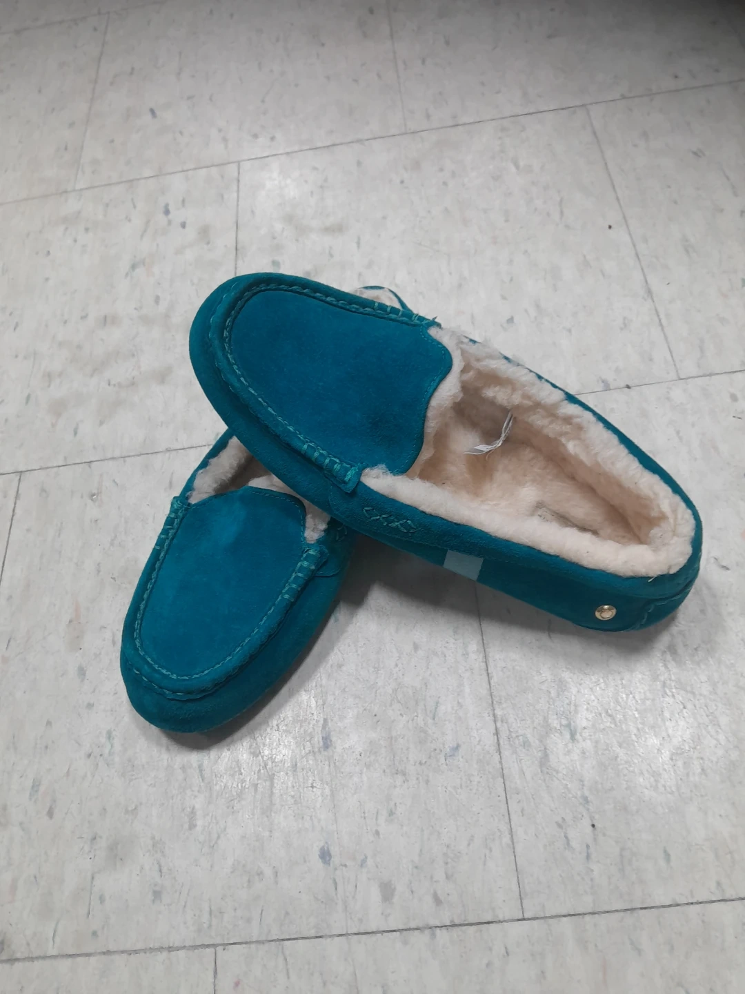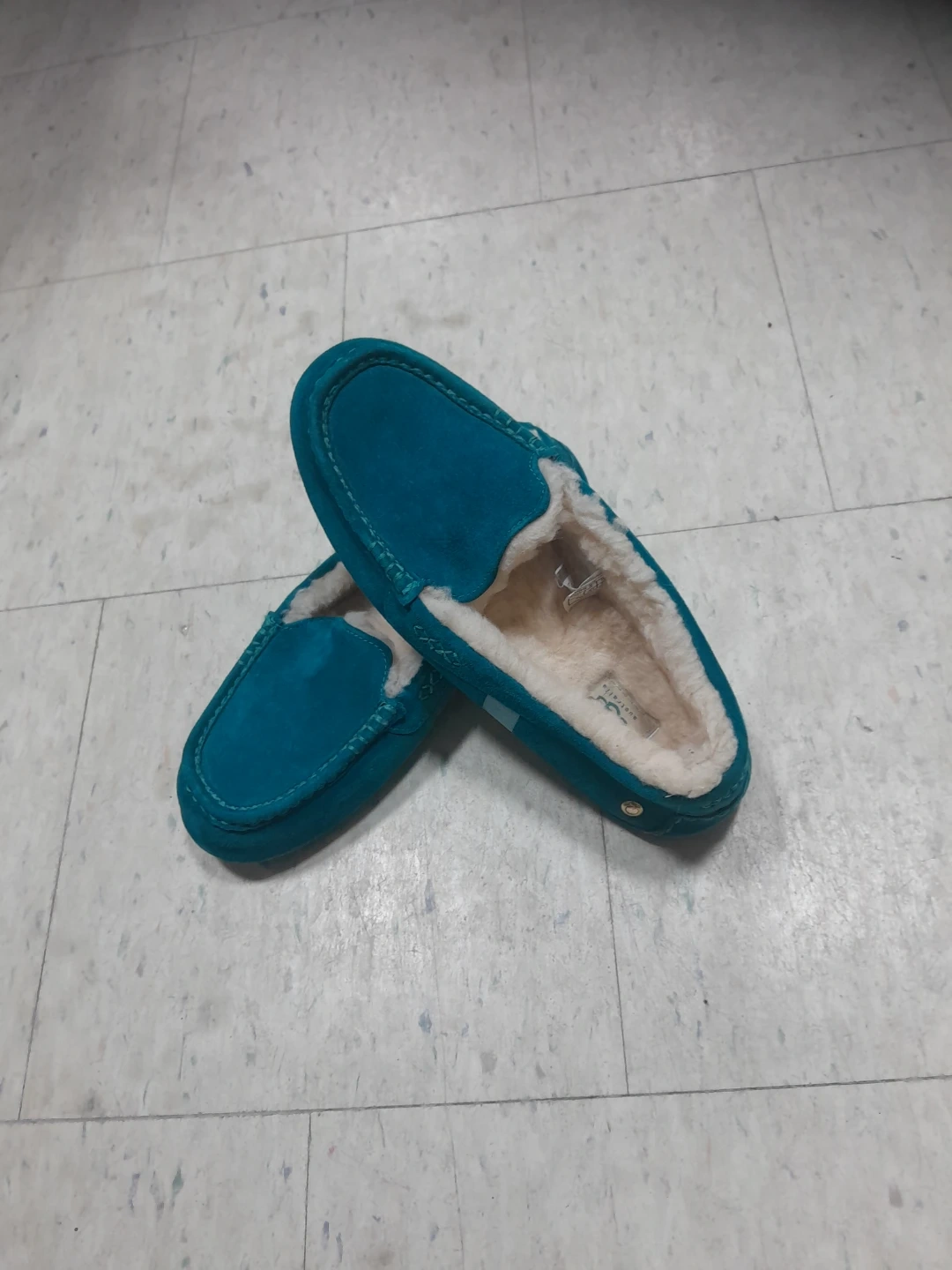 Cozy up with these UGG moccasin slippers! They're a beautiful teal colour and in great condition. Perfect for keeping your feet warm on chilly days. Size 12