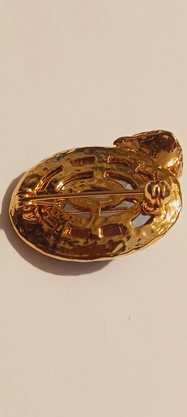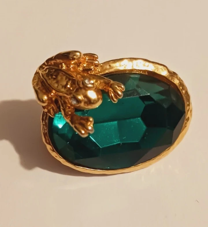 Here's a charming brooch featuring a golden frog perched atop a large, emerald-colored glass broich. It's a unique and eye-catching piece to add a touch of whimsy to any outfit. The gold tone complements the deep green of the stone beautifully !!! Excellent condition. ALL MY PRICES ARE NEGOTIABLE !!! This would make beautiful addition to your vintage jewelry collection !! It would make a great VALENTINE'S DAY GIFT 🎁 . 1.5"×1".