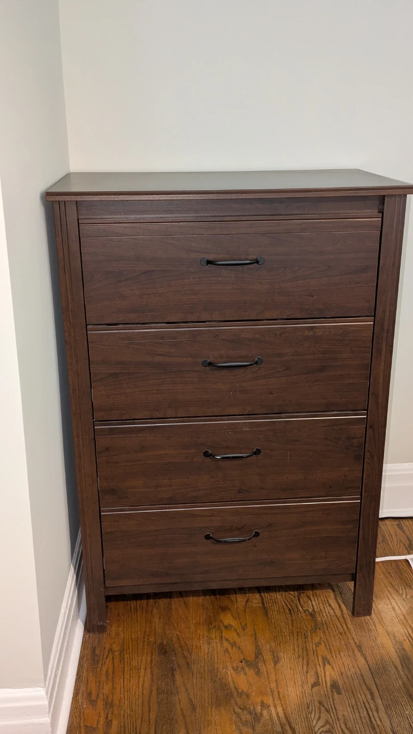 Selling a dark wood Ikea dresser with four drawers! It's in good condition and would be perfect for adding some extra storage to your bedroom or any other space in your home. The drawers slide smoothly, and it's a sturdy piece of furniture.