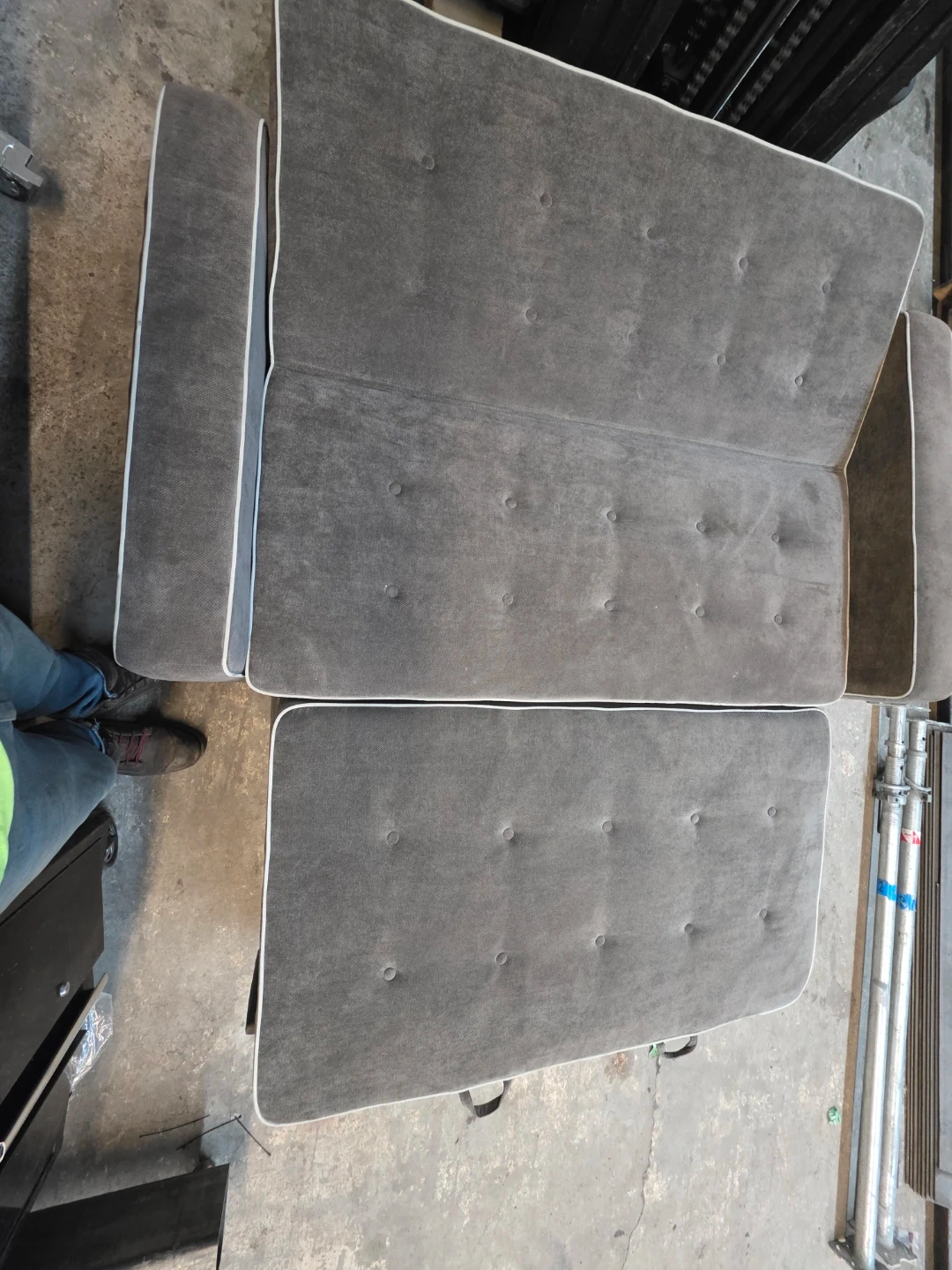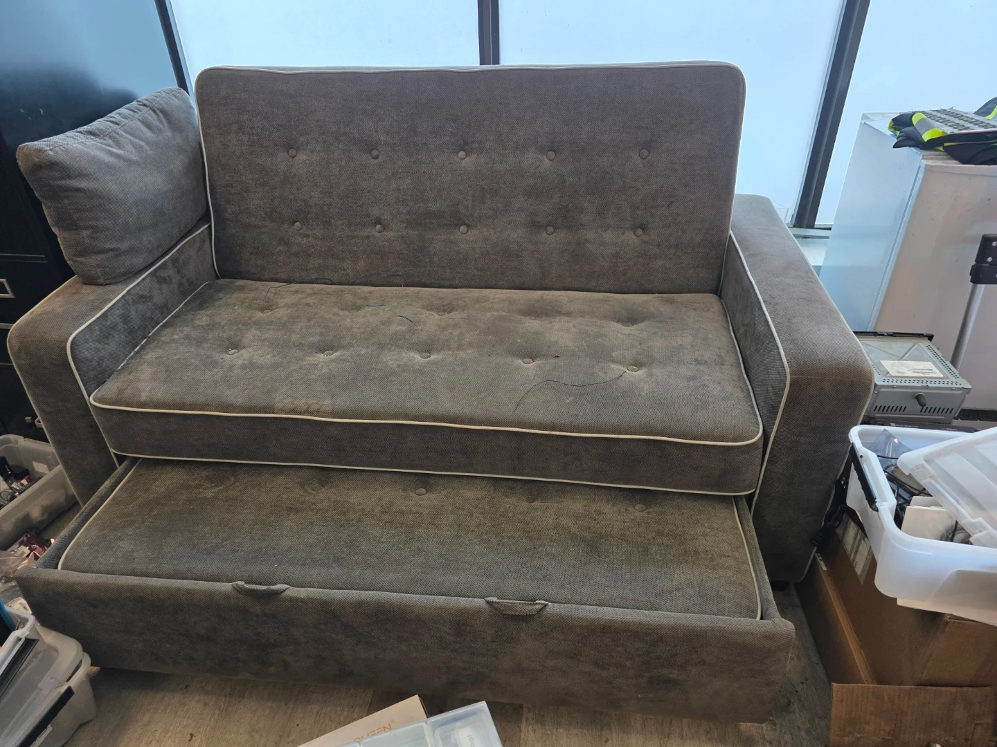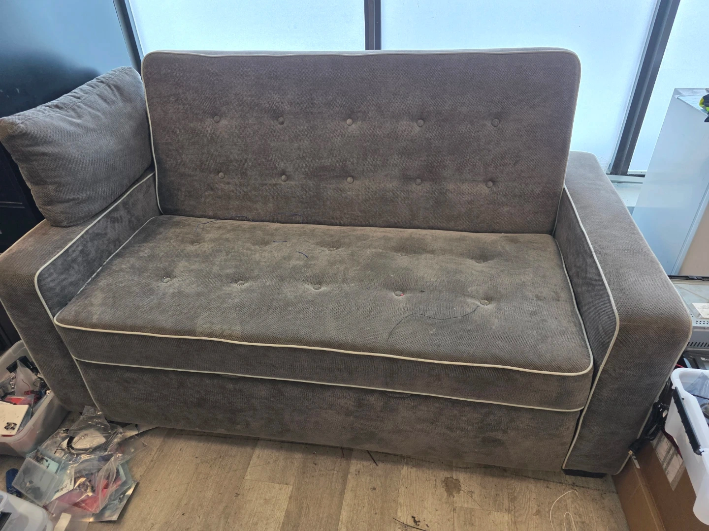 Selling a comfy grey sofa bed! It features a convenient pull-out trundle, perfect for guests or maximizing space. The sofa has a stylish design with button detailing. It's in good condition and ready for a new home!