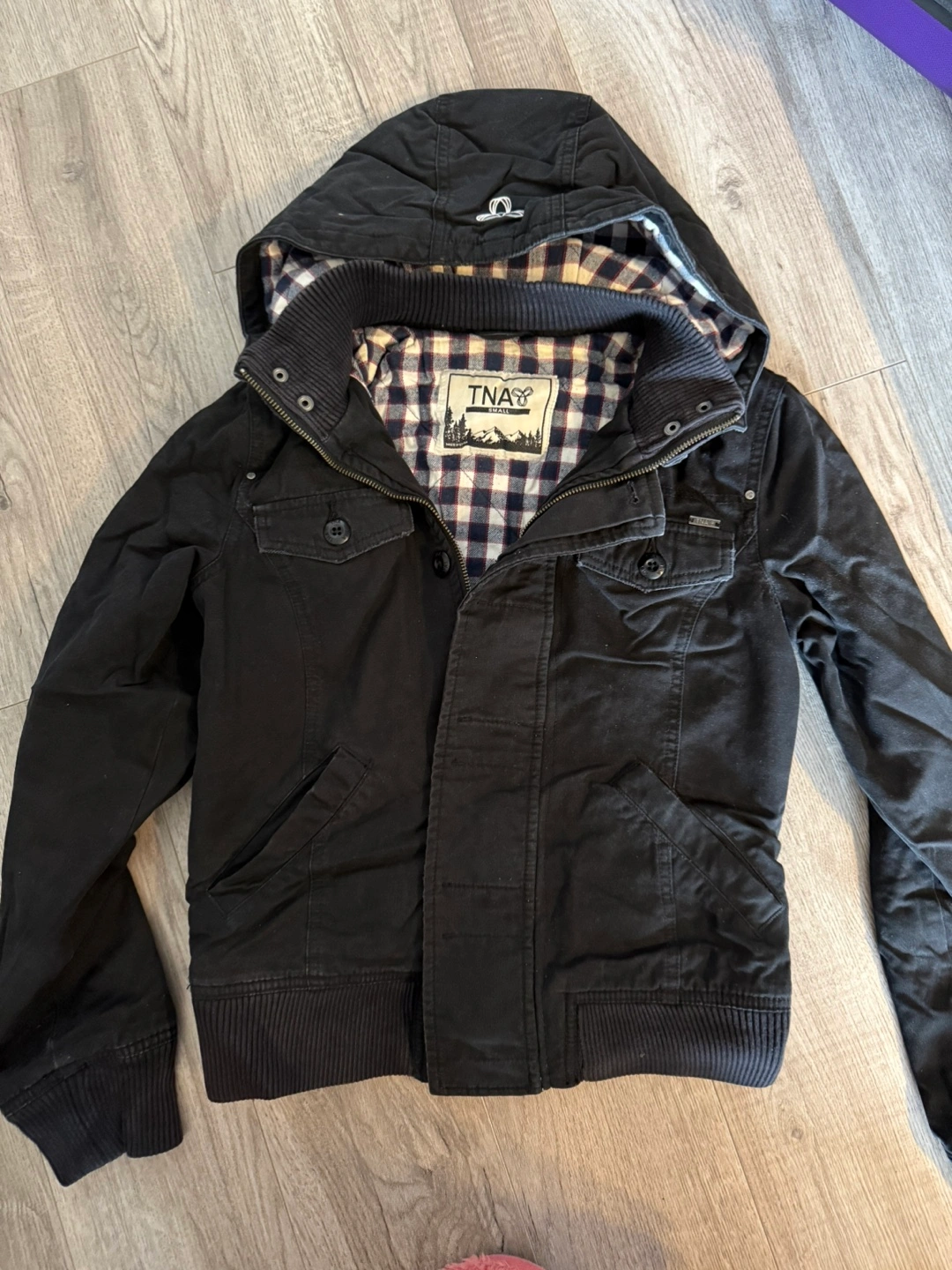 Selling a TNA jacket in black! It's a size small and in great condition. The jacket has a hood and a stylish plaid lining. Perfect for layering! Pick up by the Eaton Center at my condo, $10.