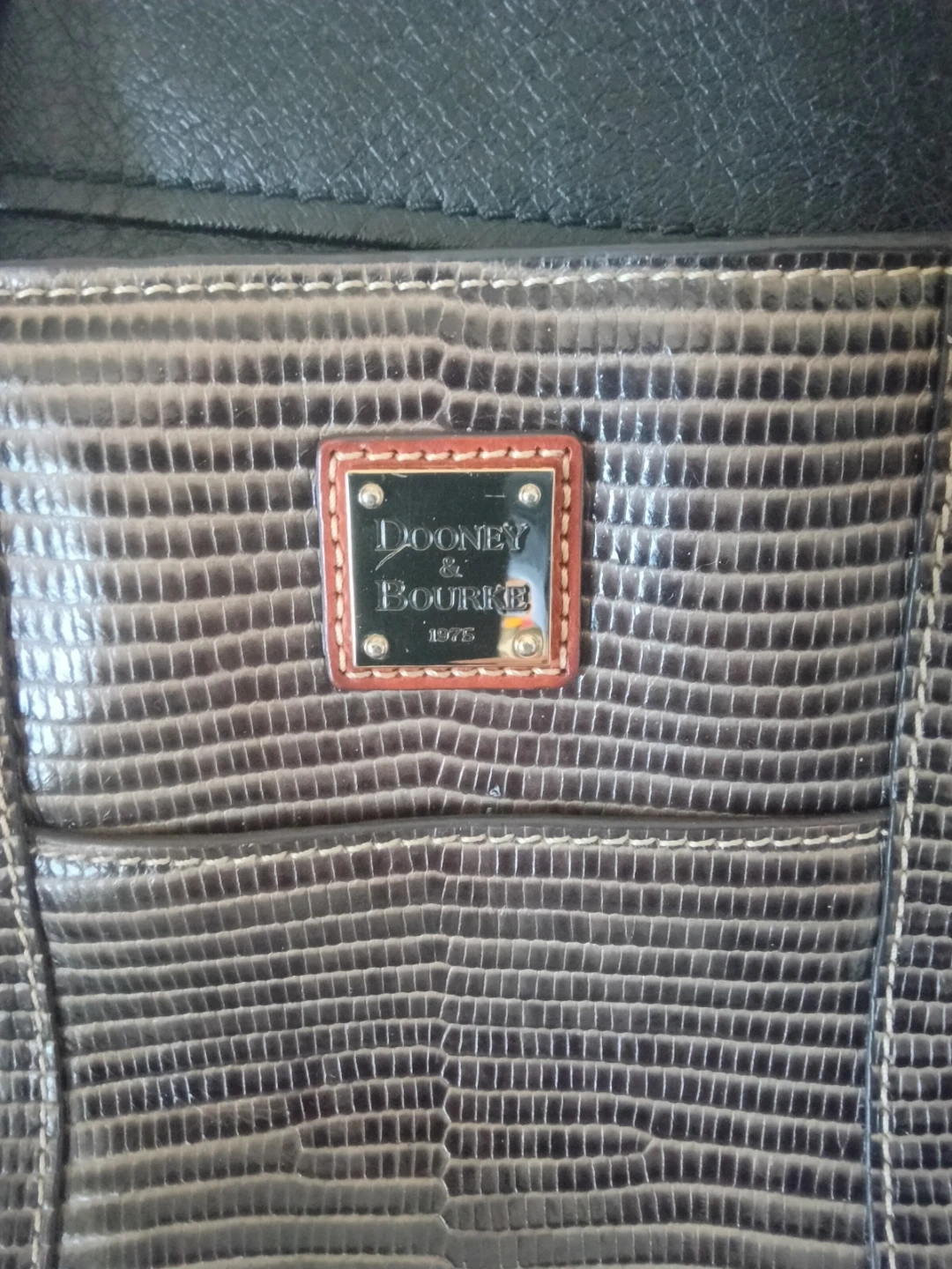 Dooney & Bourke tote bag with a unique textured pattern. The bag features brown leather straps and trim, complemented by a silver-toned logo plaque. It's in good condition and ready for a new owner