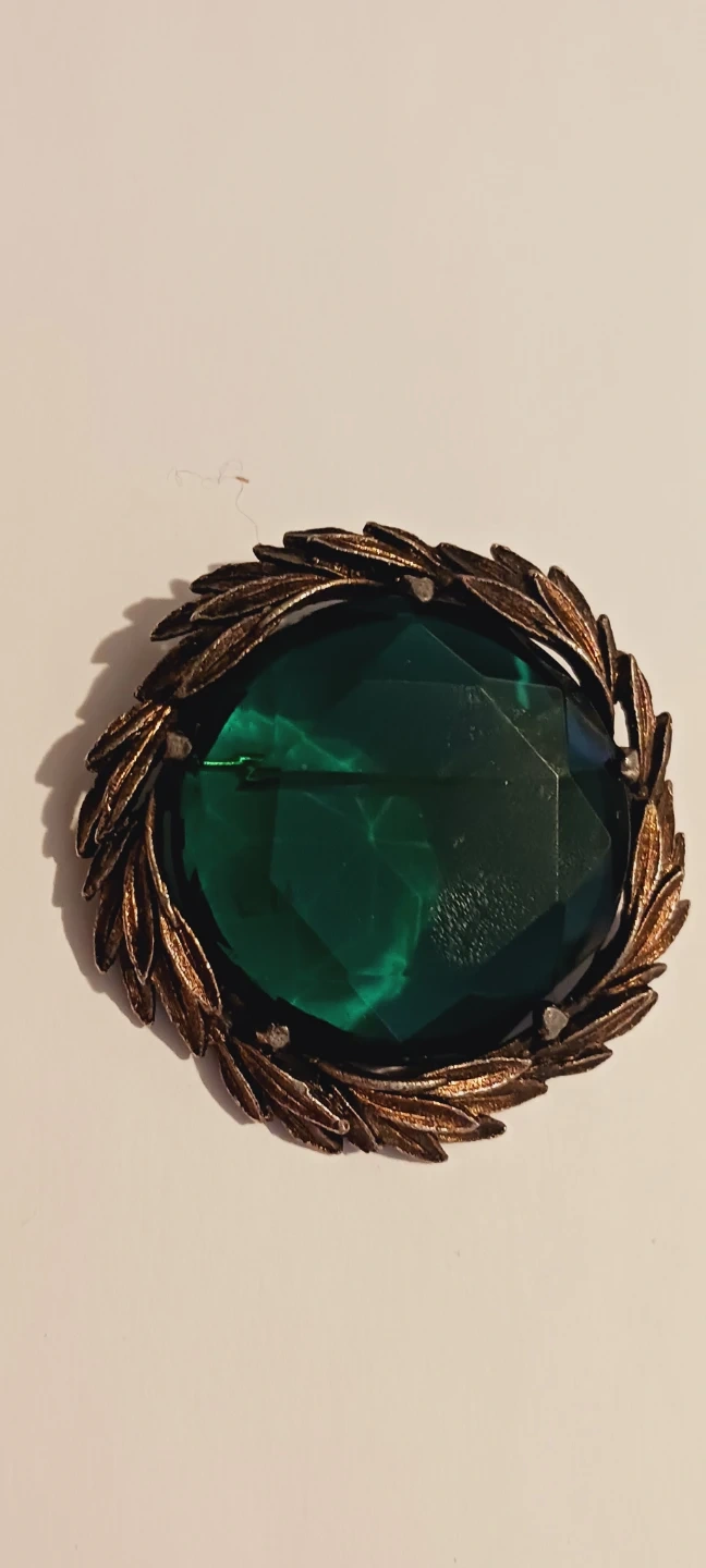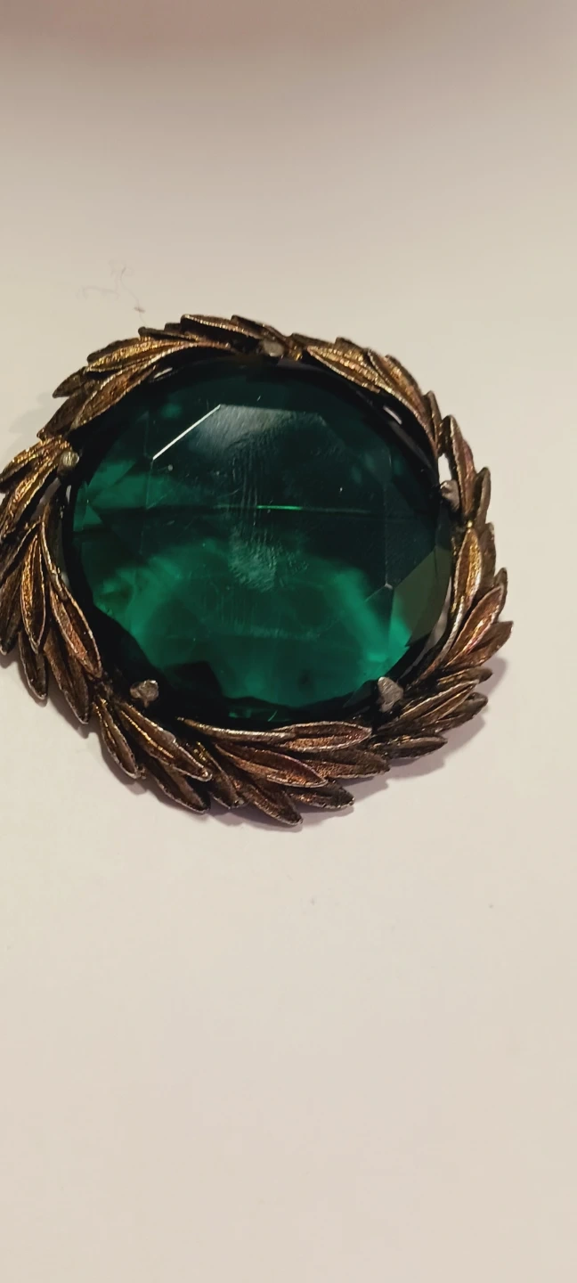 Gorgeous vintage brooch/ Pendant in one featuring a large emerald green glass stone. It has a decorative silver tone metal setting with a leaf design. It's a unique and eye-catching piece!!! 2.3" diameter. Excellent condition. ALL MY PRICES ARE NEGOTIABLE !!
