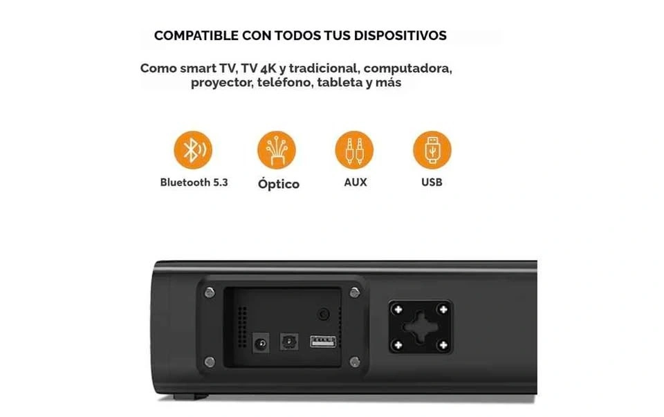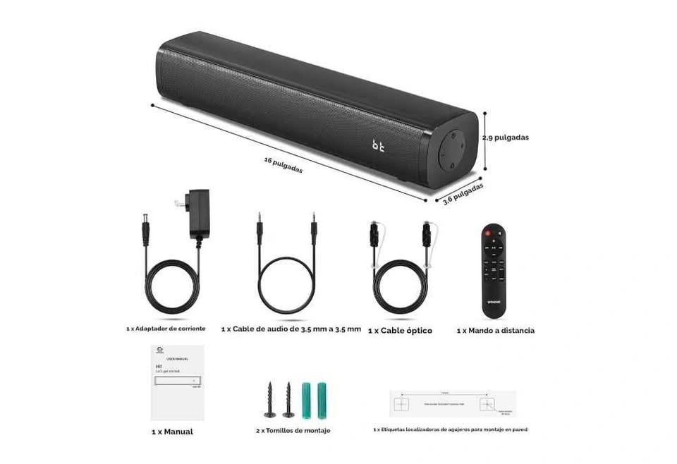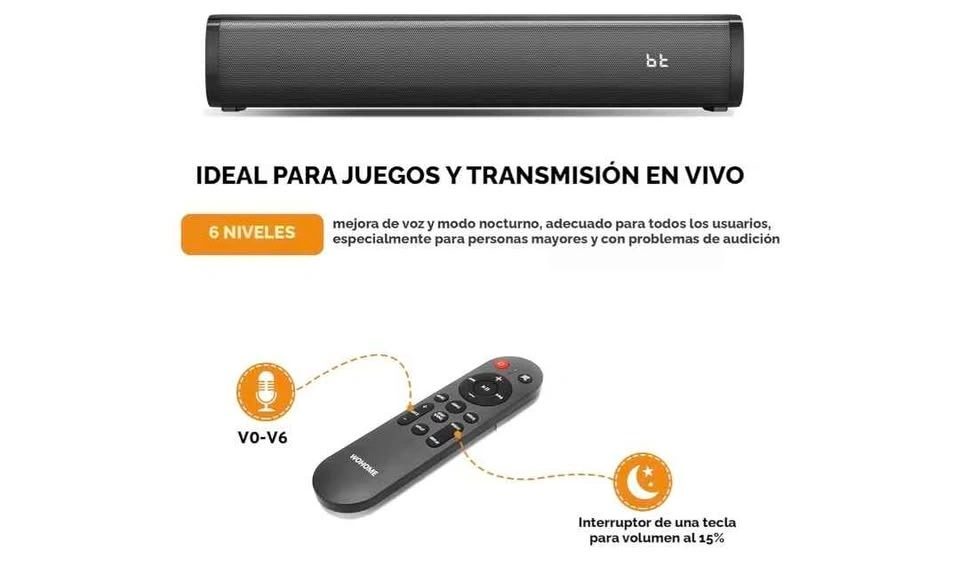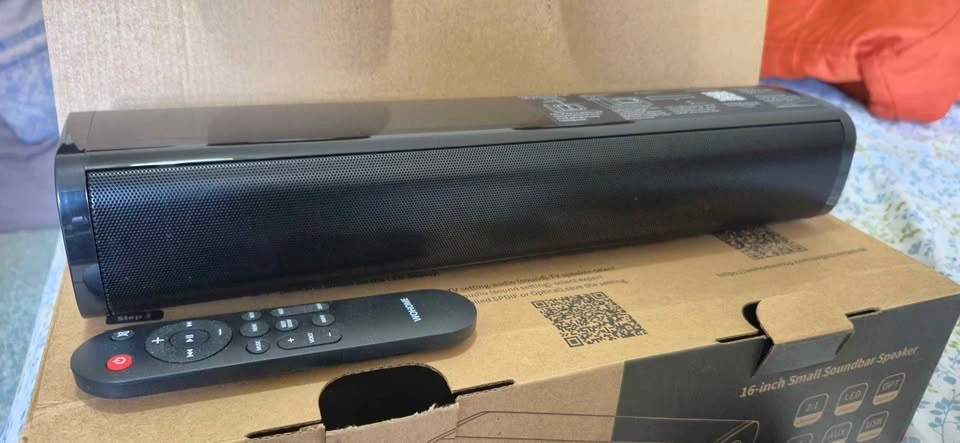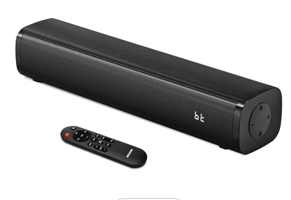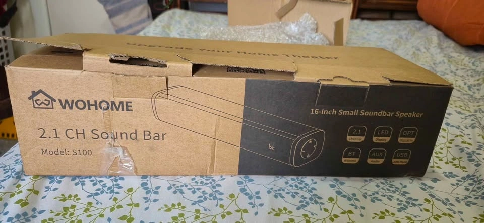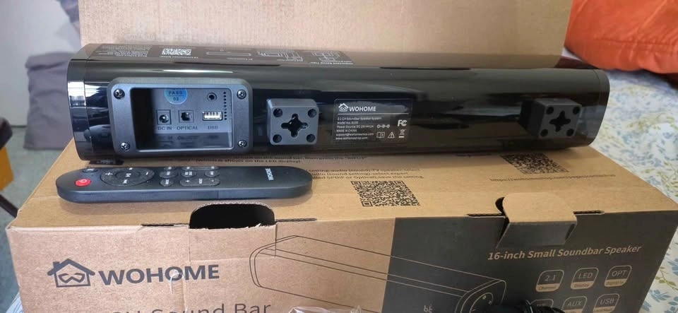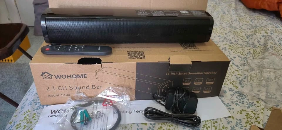 Wohome S100 16-inch mini soundbar for TV with built-in subwoofer. Features Bluetooth 5.3, optical/AUX/USB connections, and 6 levels of voice enhancement. Let me know if you're interested!