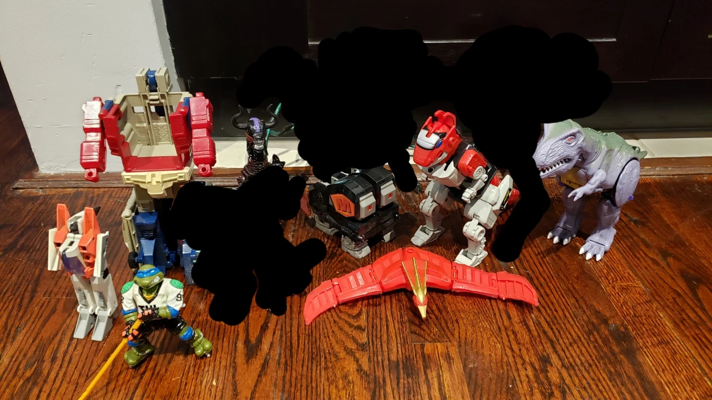 Includes: Transformers Powermaster Optimus Prime, G2 Starscream, Beasties Megatron; Mighty Morphin Power Rangers Tyrannosaurus, Mastodon, Firebird Thunderzord; Aliens Bull Xenomorph; Ninja Turtles Hockey Leonardo.