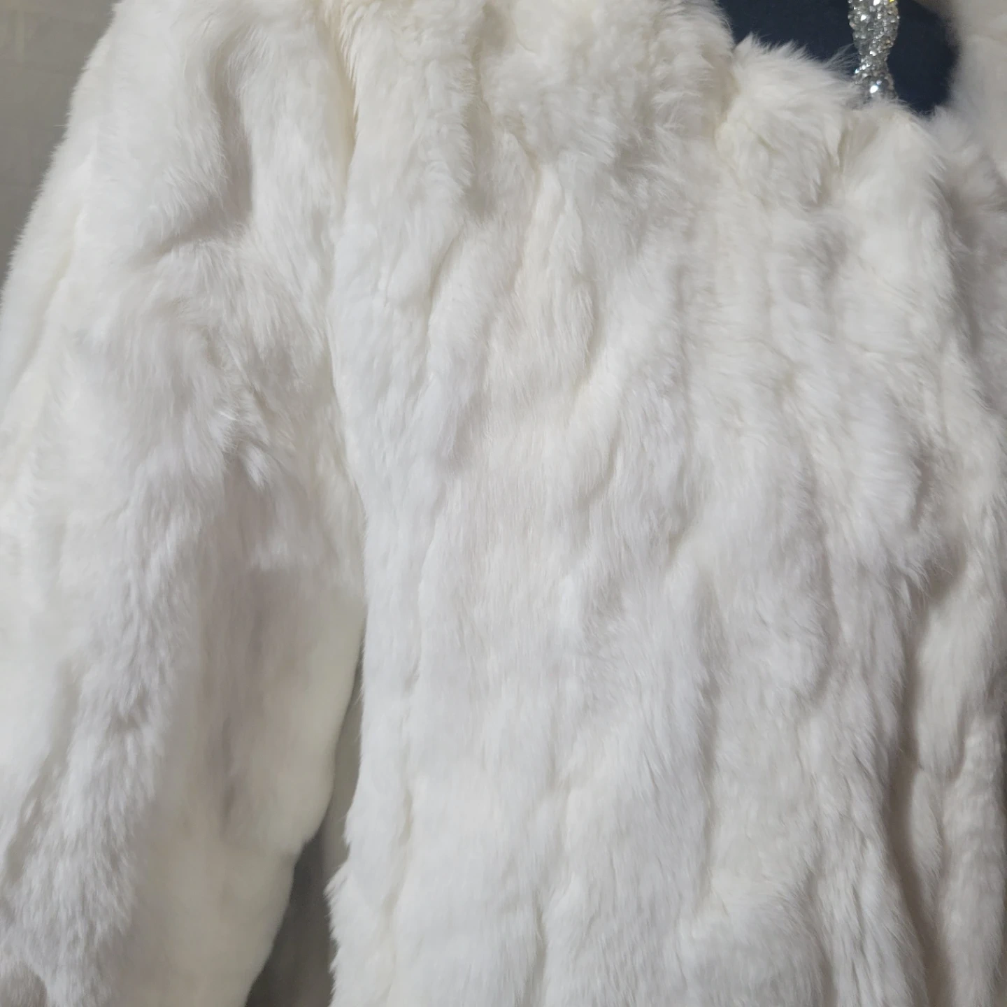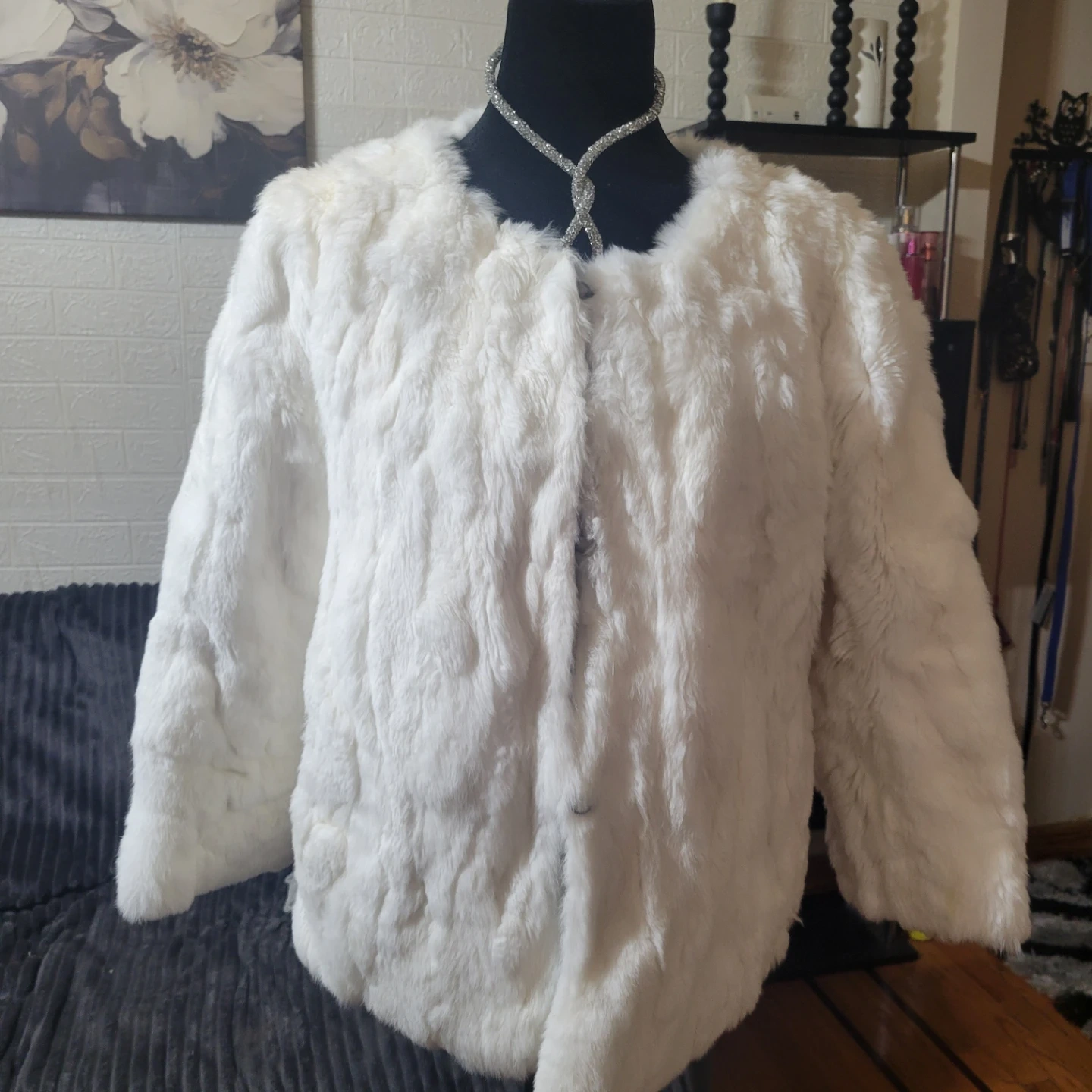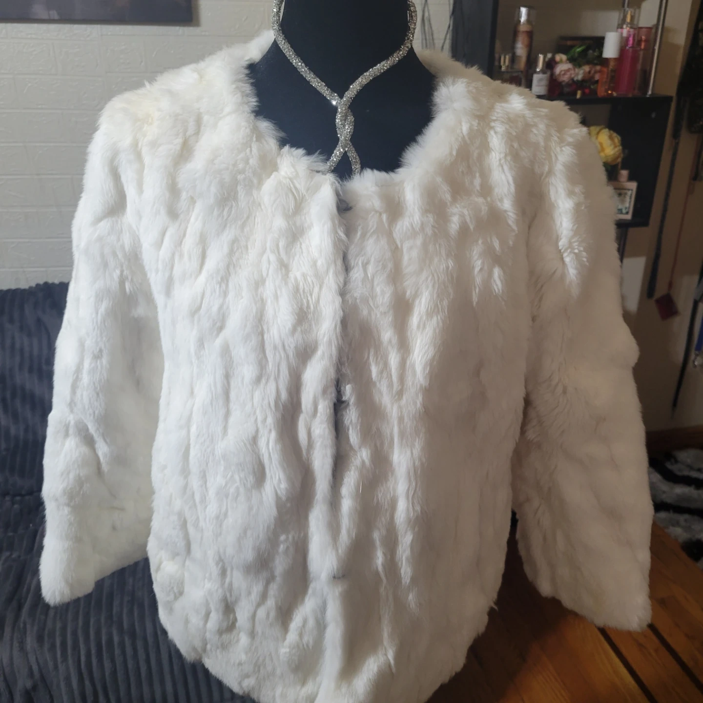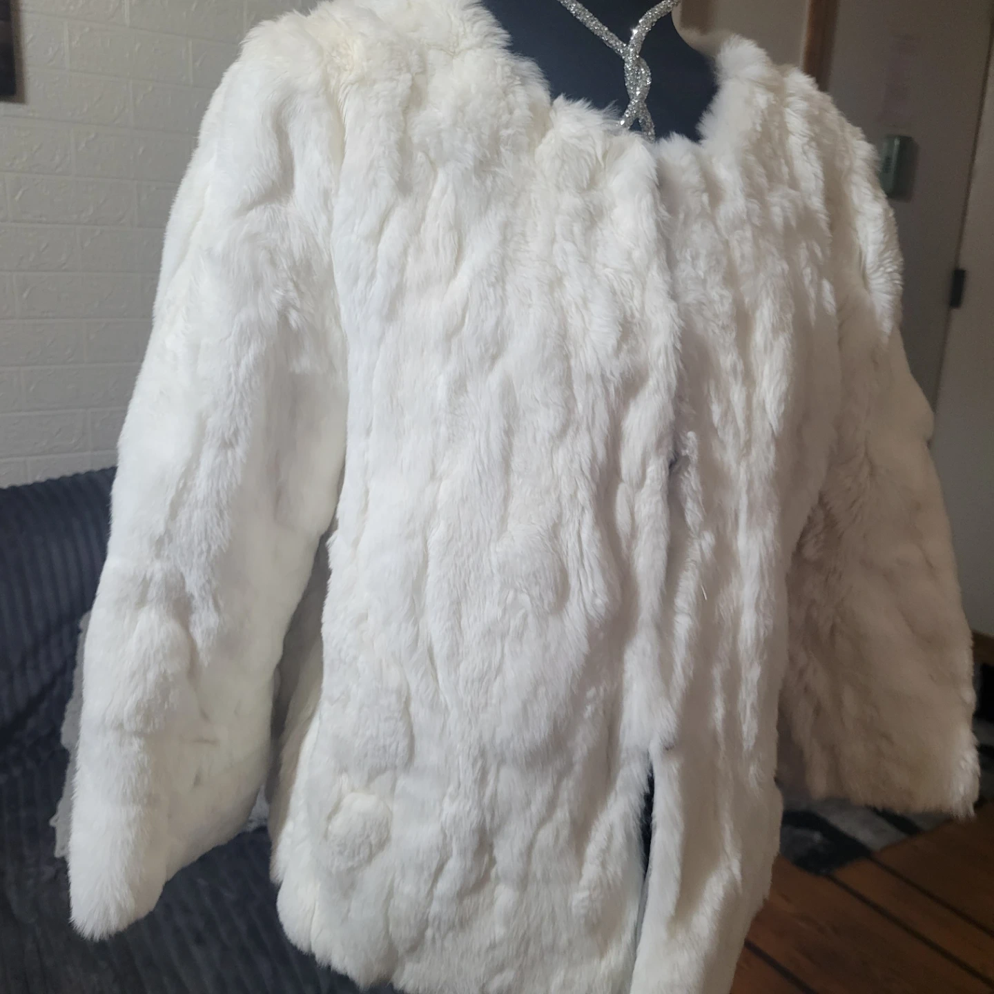 This is a fluffy white faux fur jacket. It's super soft and in great condition! Perfect for adding a touch of warmth and style to any outfit.