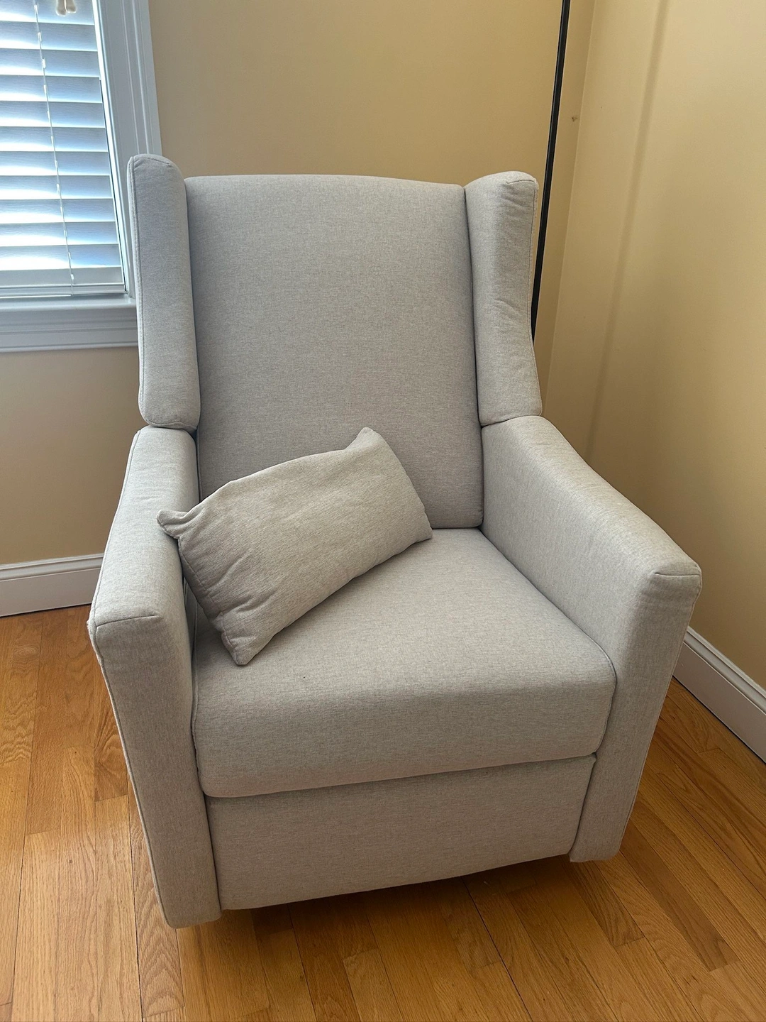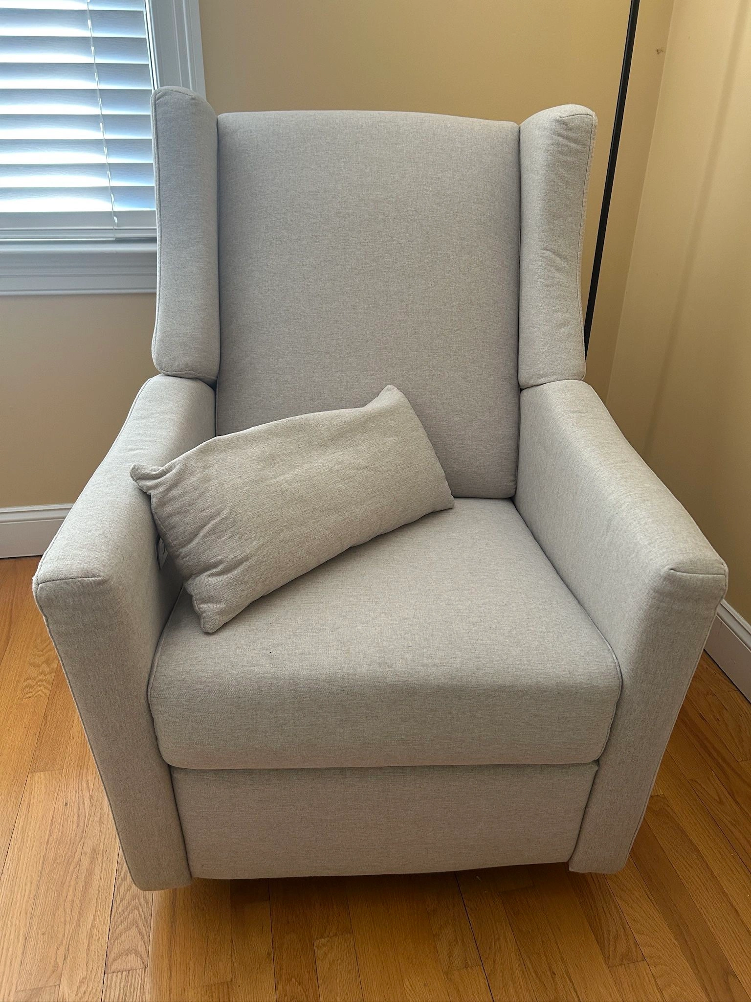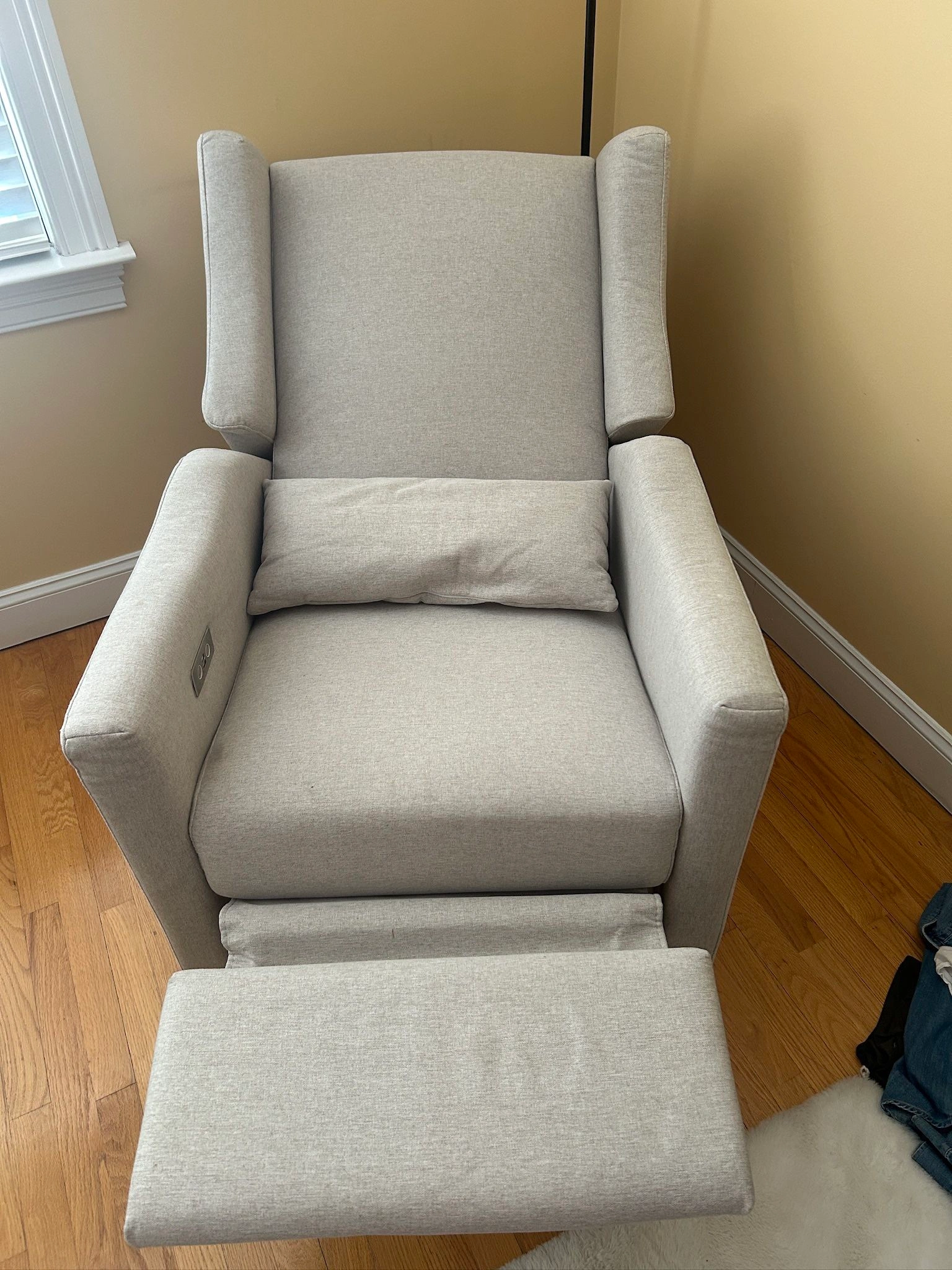 Comfy rocking chair with built-in USB port that reclines with a push of a button! The button allows you to position the headrest and footrest as you please.