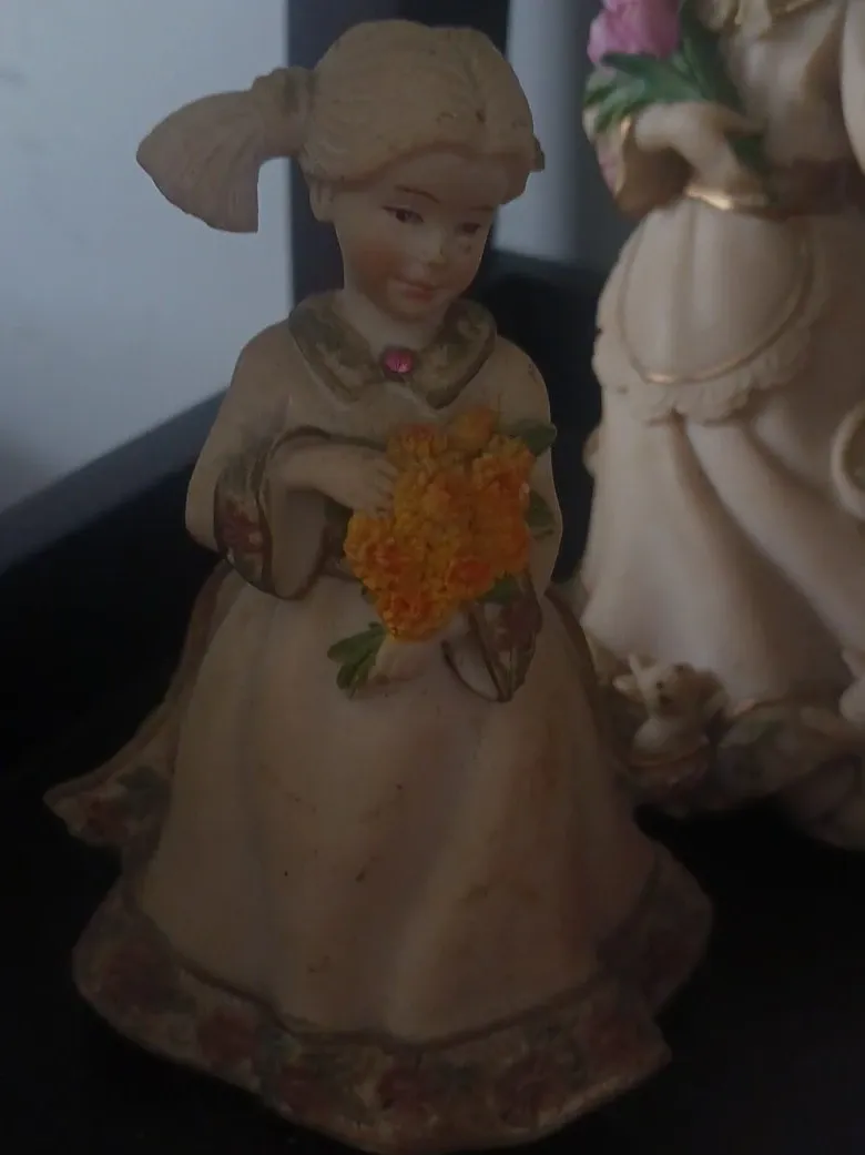 A charming vintage figurine of a girl holding flowers. It has a classic, delicate design. Perfect for adding a touch of nostalgia to any room!