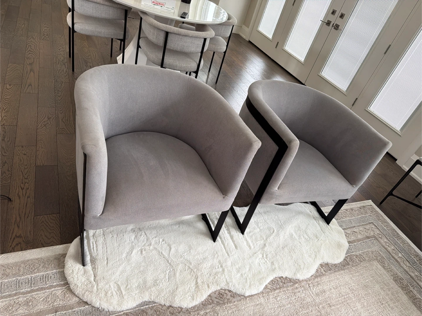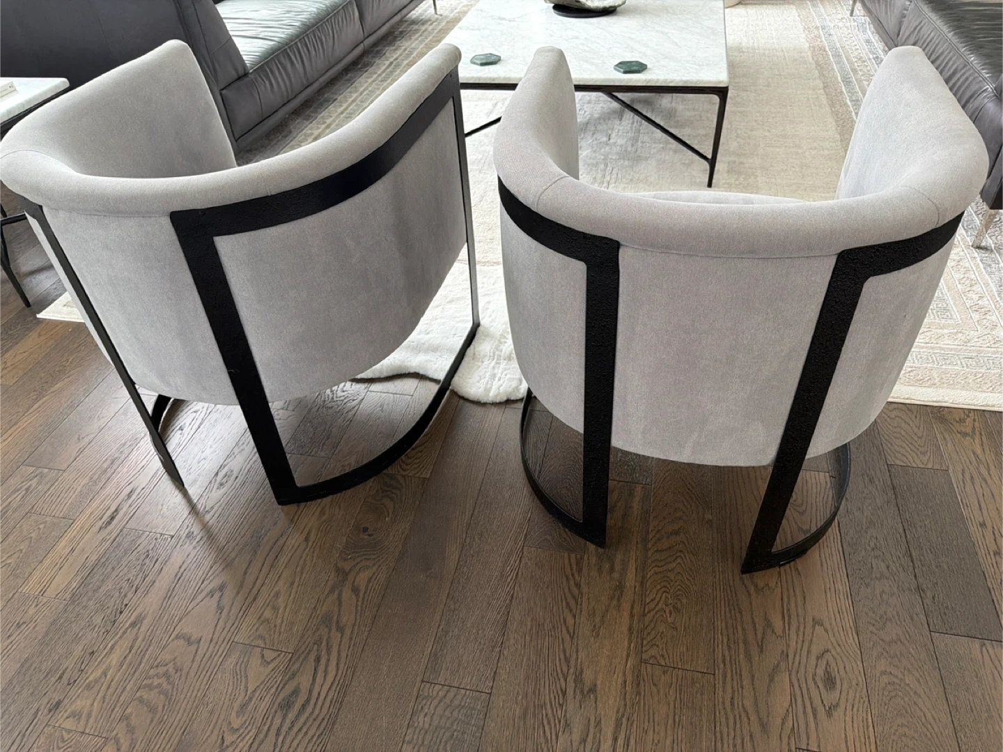Selling a set of two grey barrel accent chairs. They're in great shape and would look lovely in any living space! The chairs feature a sleek, modern design with black accents. Perfect for adding a touch of elegance to your home