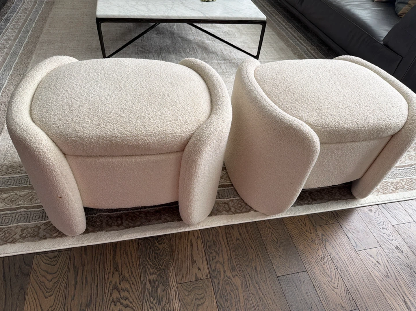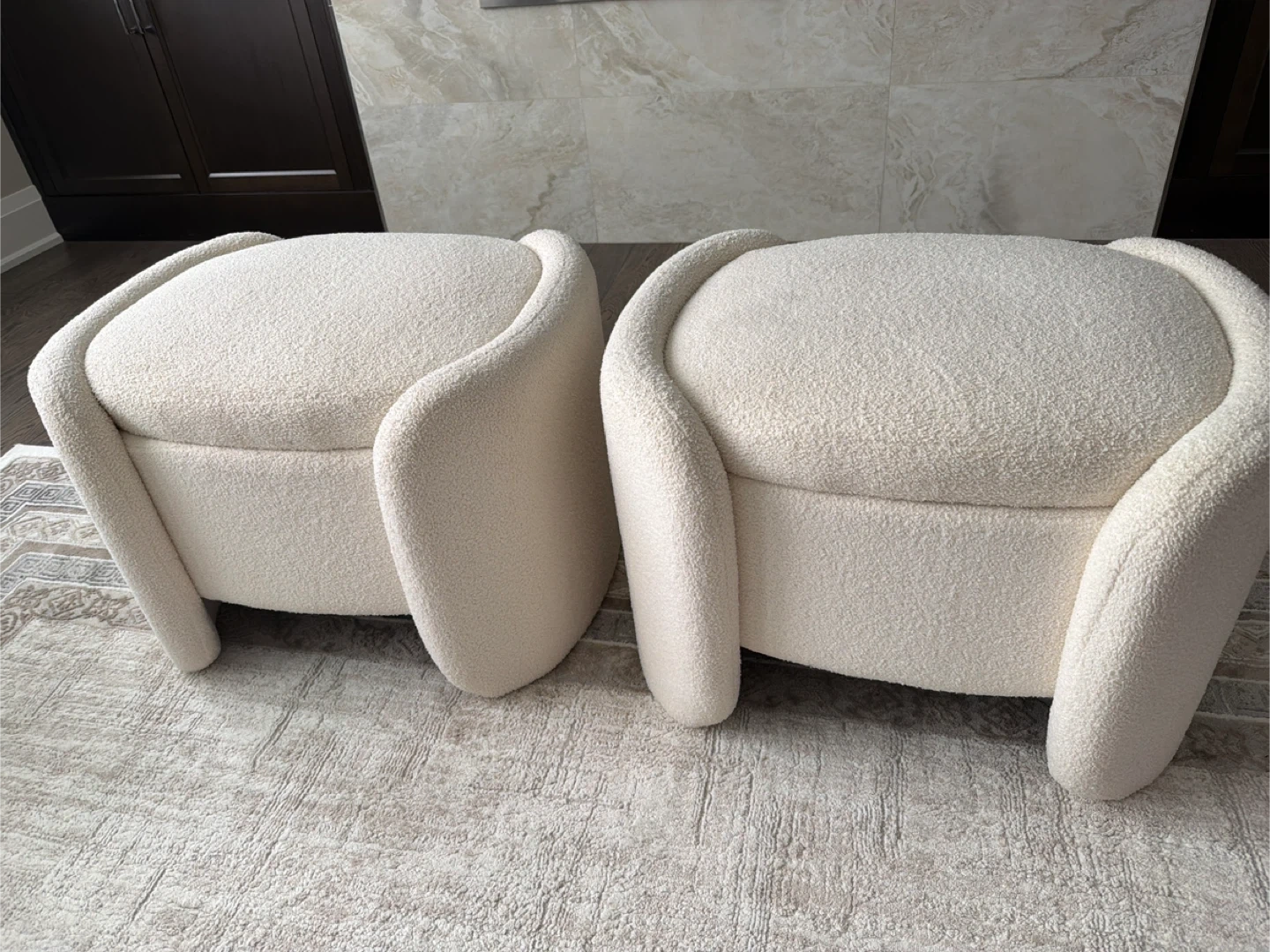 Selling these stylish boucle ottoman stools. They're in great condition and would add a touch of cozy chic to any room! The soft boucle texture is so inviting, and they're perfect as extra seating or just to put your feet up after a long day