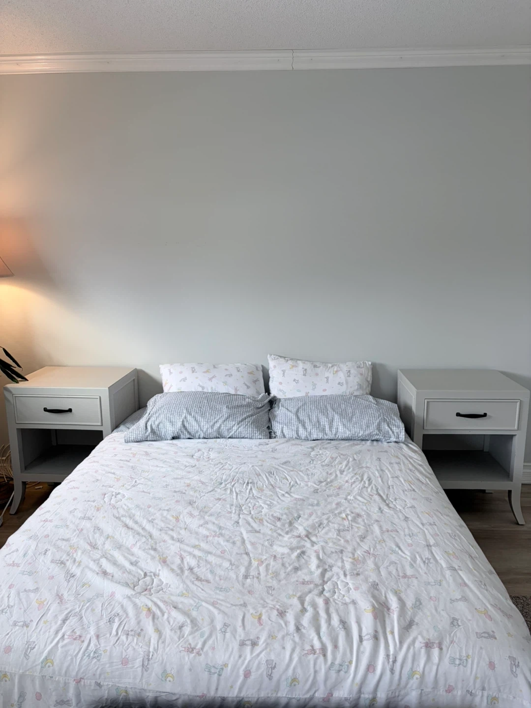 Selling a set of two white nightstands. They have a classic design with a drawer and an open shelf for storage. Great for adding a touch of elegance to your bedroom! 180 OBO