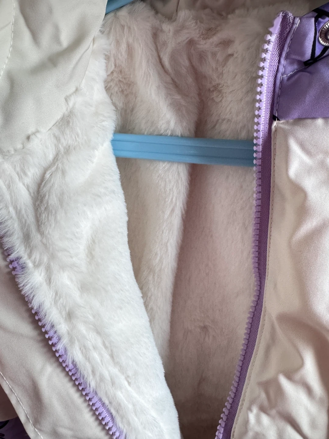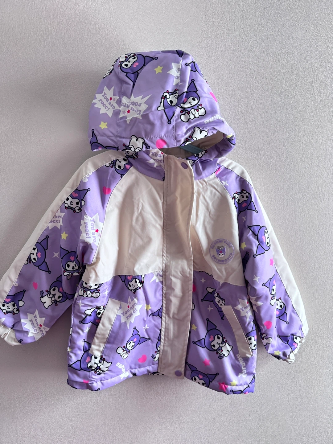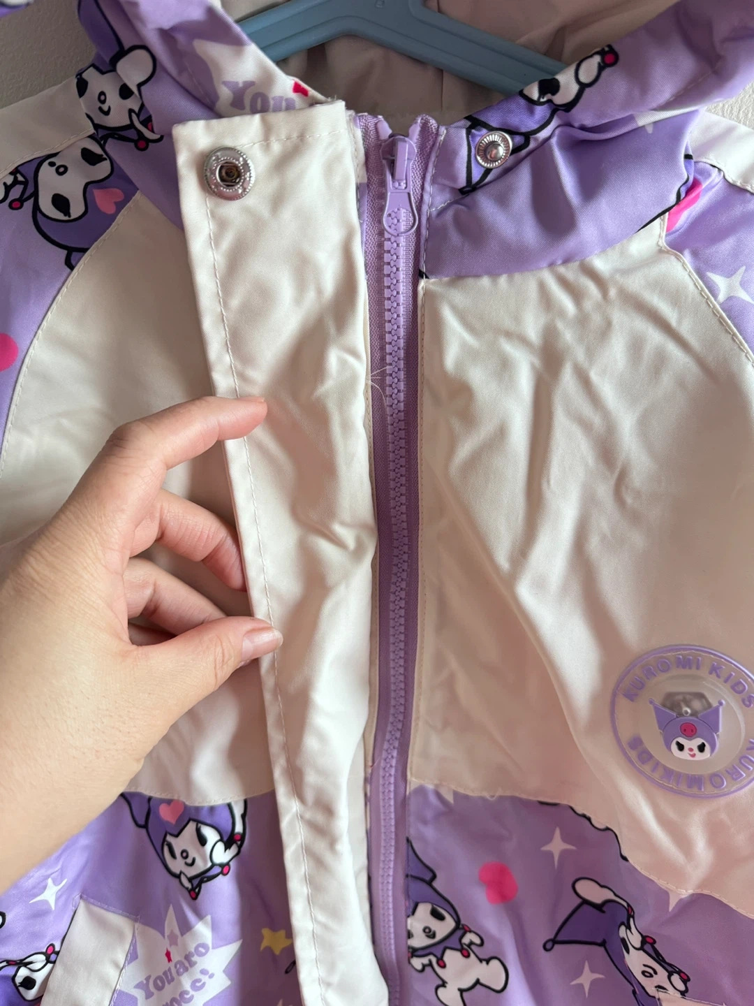 Super cute Kuromi Kids jacket with lighting button! It's purple and white with Kuromi character designs all over. The inside is lined with soft, white faux fur for extra warmth. Perfect for keeping your little one cozy and stylish!