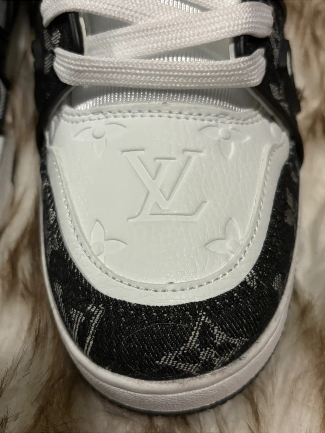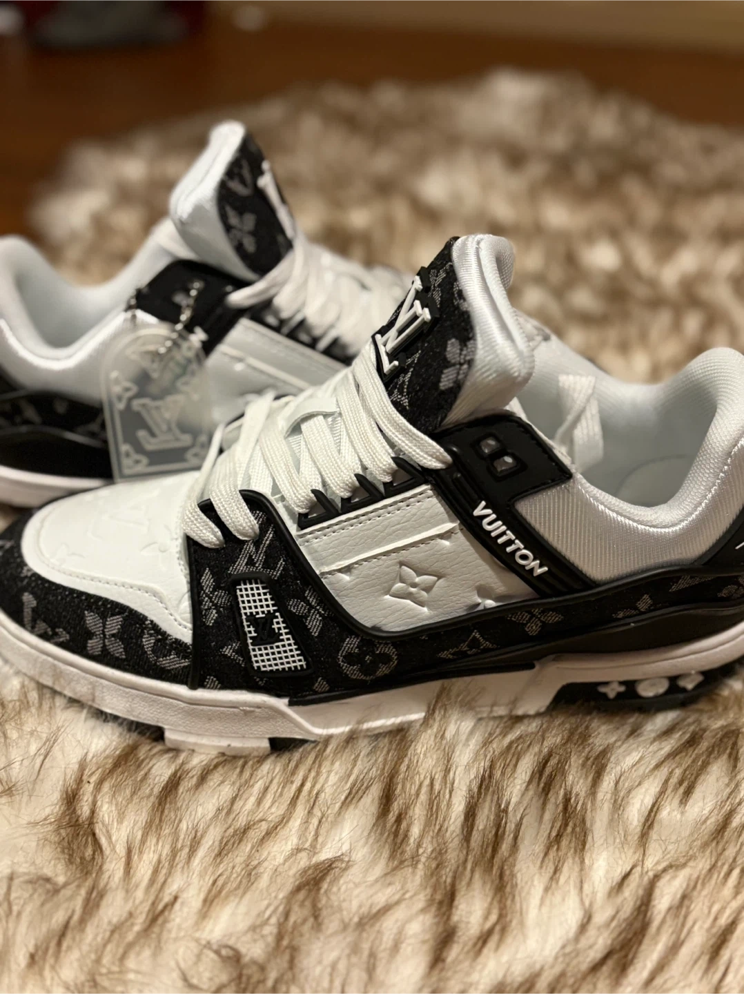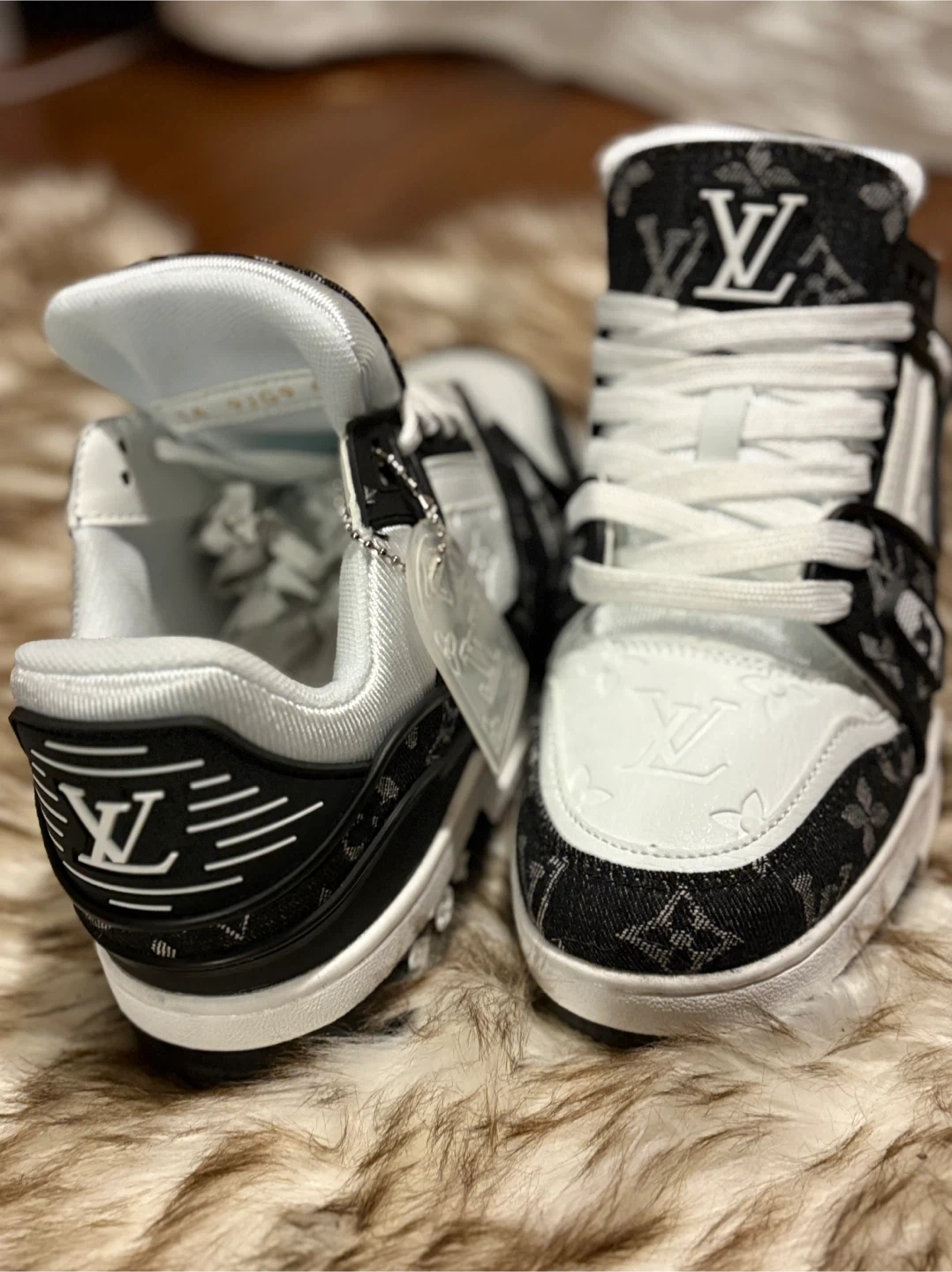 Selling a pair of Louis Vuitton sneakers in black and white. They feature the iconic LV logo and a stylish design. Great for adding a touch of luxury to your everyday look!