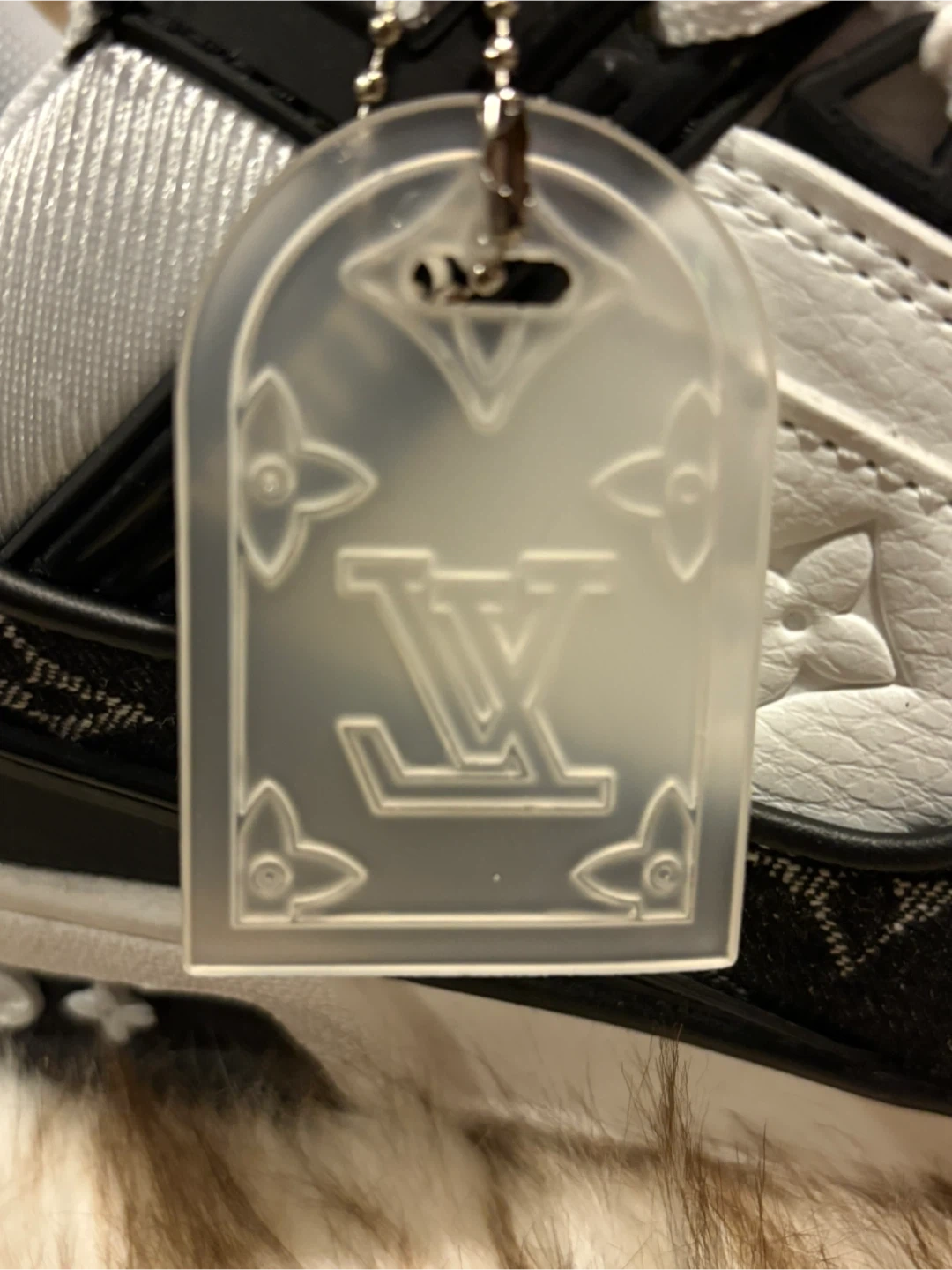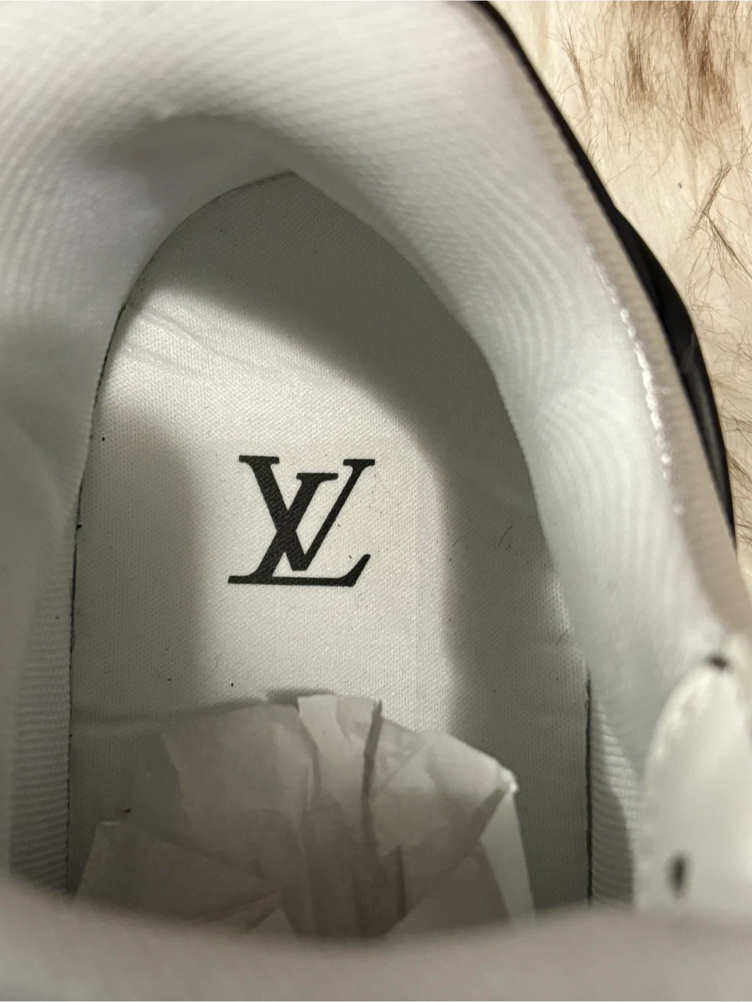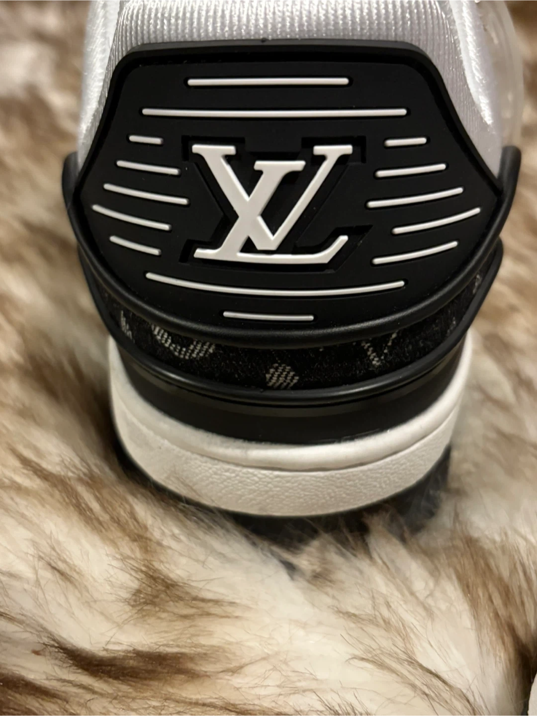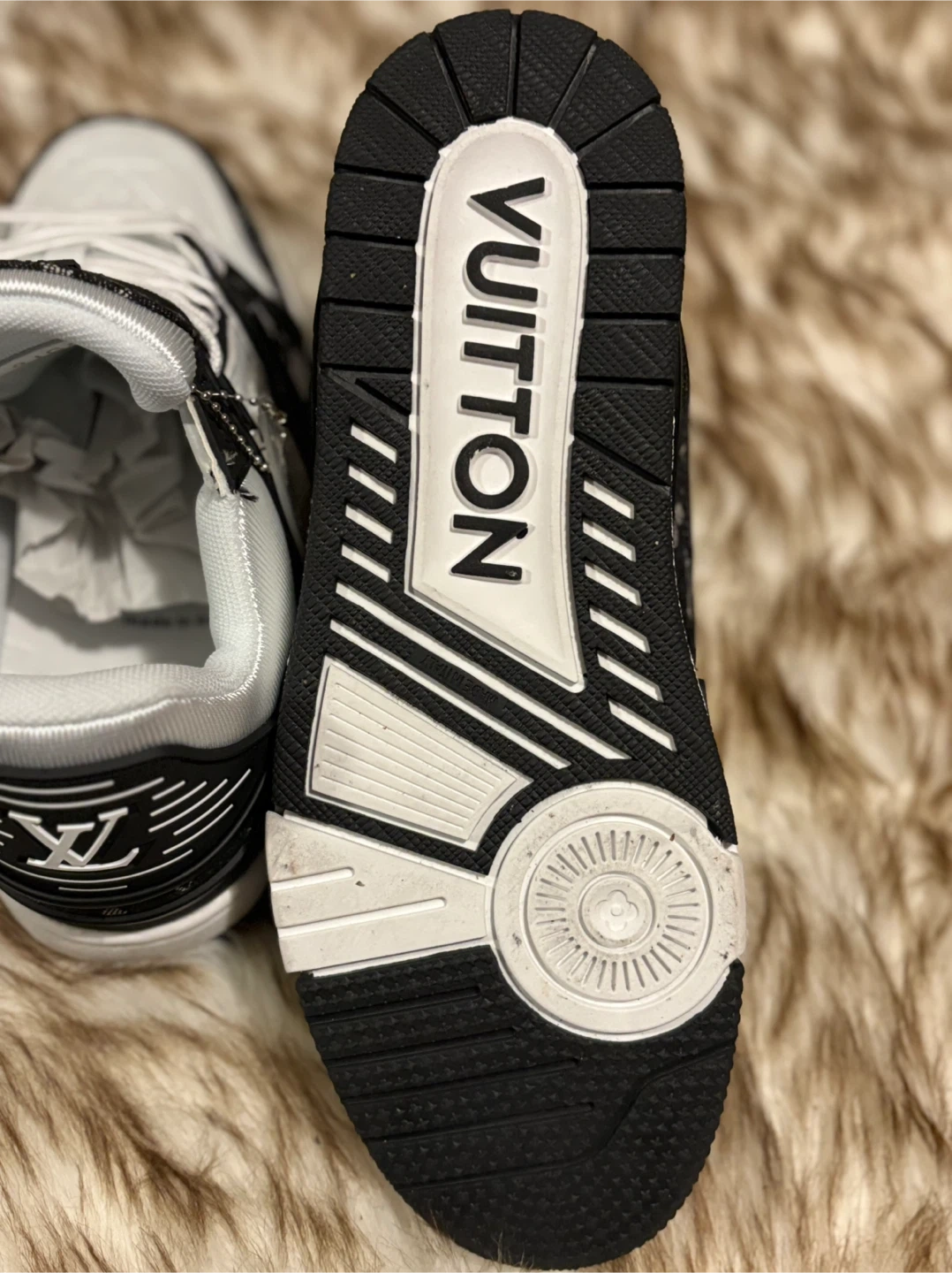 Selling a pair of Louis Vuitton sneakers in black and white. They feature the iconic LV logo and a stylish design. Great for adding a touch of luxury to your everyday look!