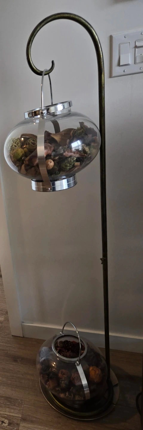 Beautiful decorative floor lantern stand with a hanging glass lantern. The lantern is filled with natural decorative elements and adds a warm and elegant touch to any living room, hallway, or bedroom. Solid metal stand with a curved hook design. The glass lantern is removable and can be refilled or customized.